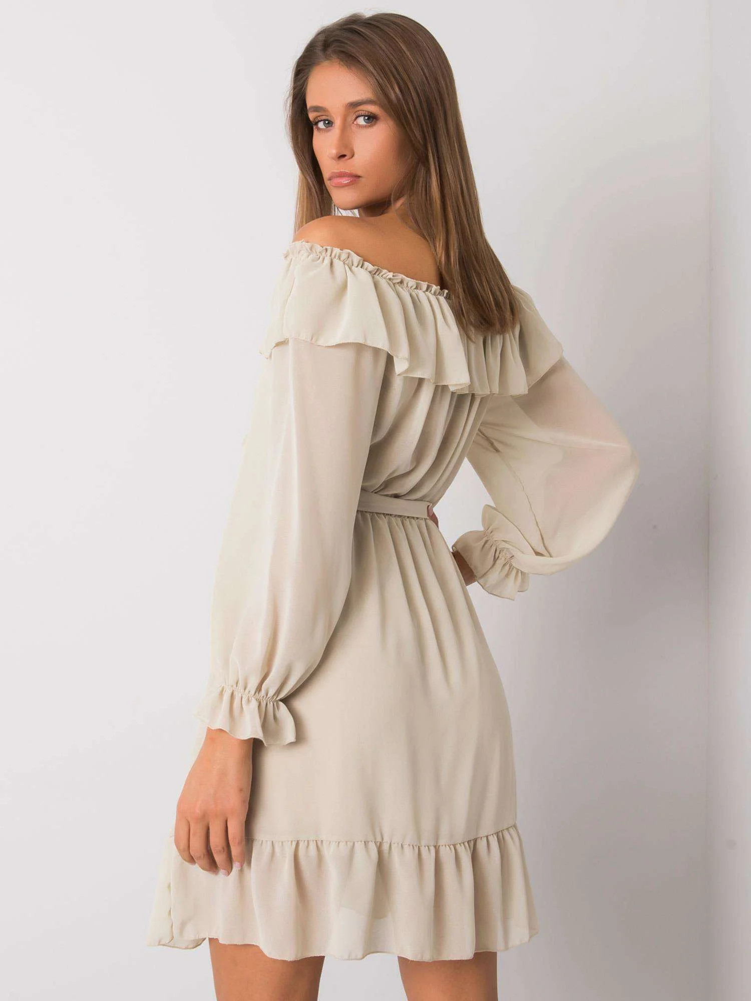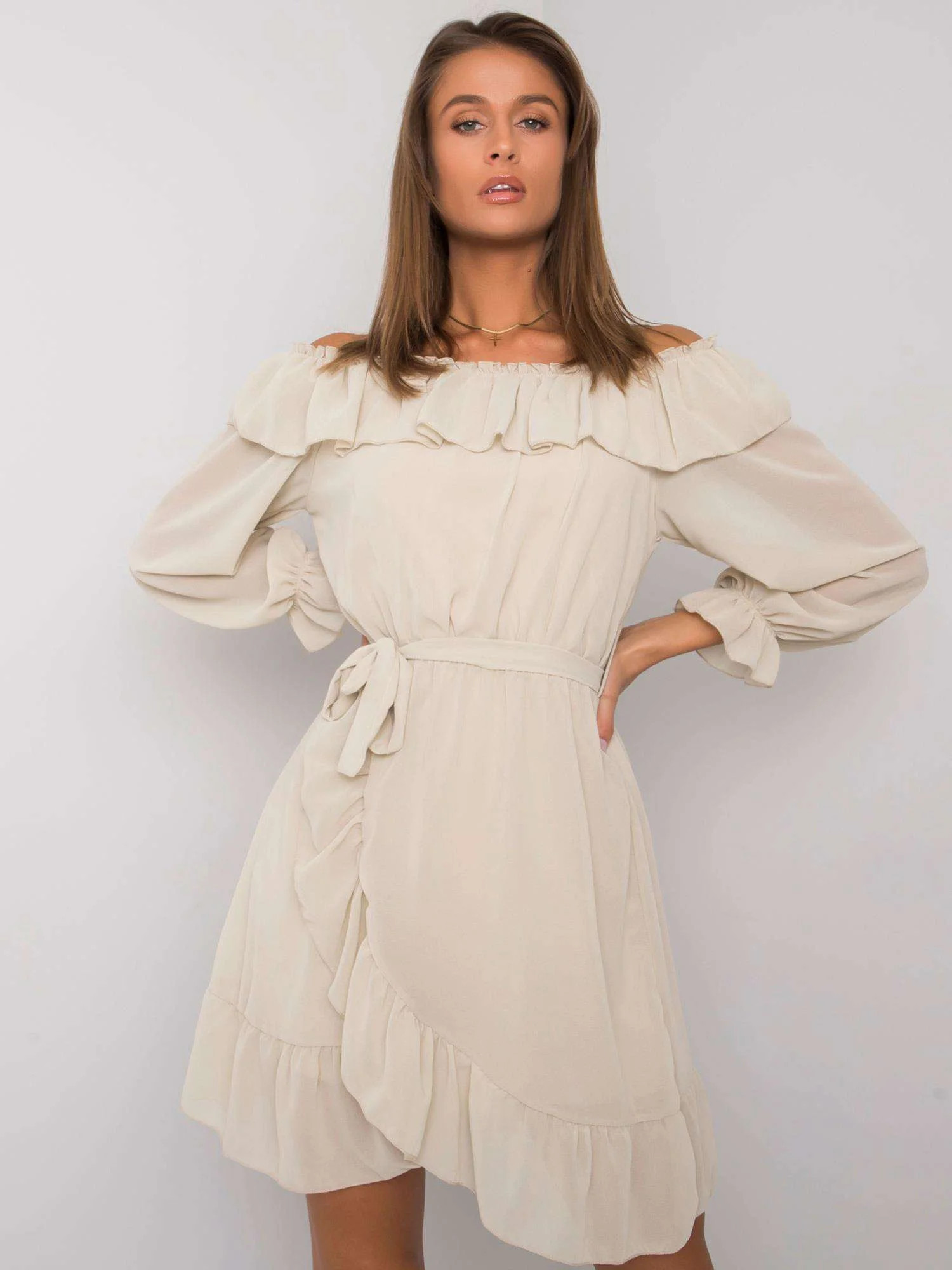 OCH BELLA Béžové šaty s dlouhým rukávem.