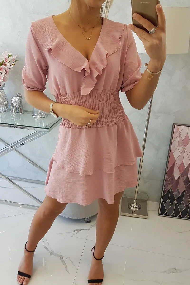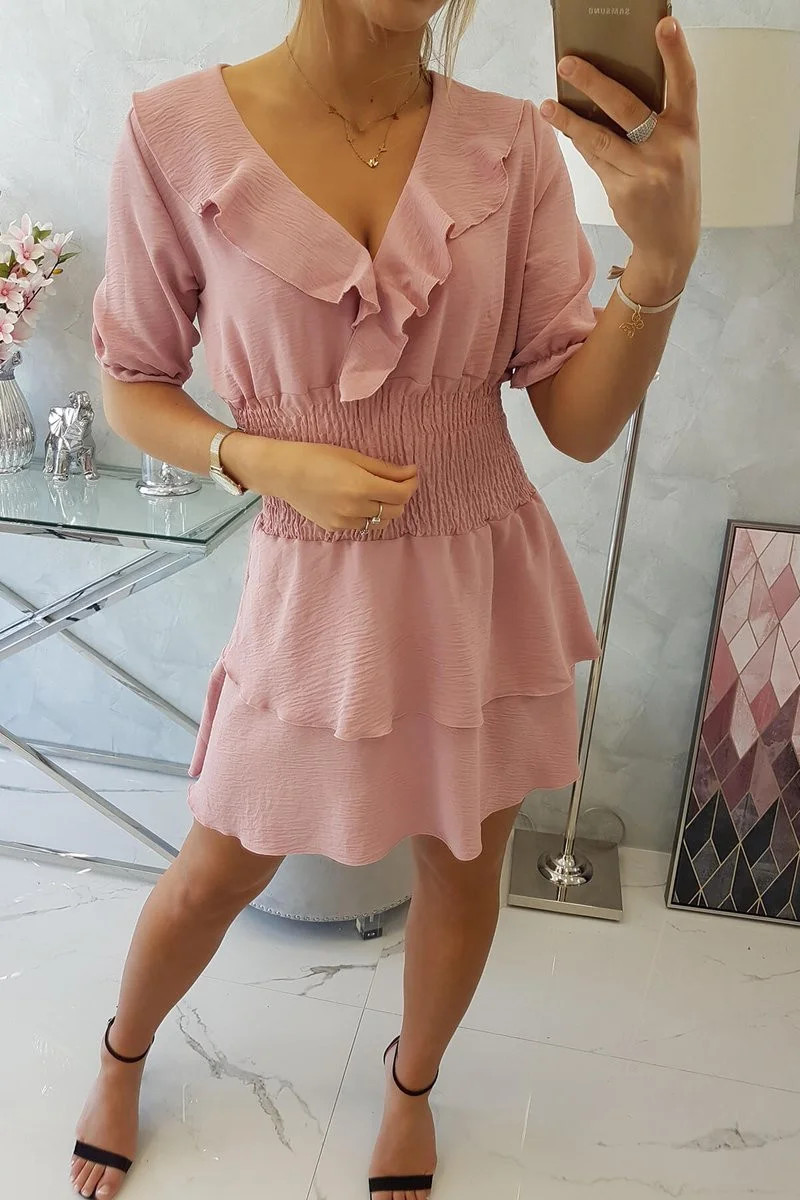 Představujeme vám módní šaty . Šaty do pasu s výstřihem do V a volánky. Šaty jsou vyrobeny z vysoce kvalitního materiálu. Ideální pro letní dny. Velikost je univerzální a vyhovuje dámám, které nosí velikost S, M nebo L.