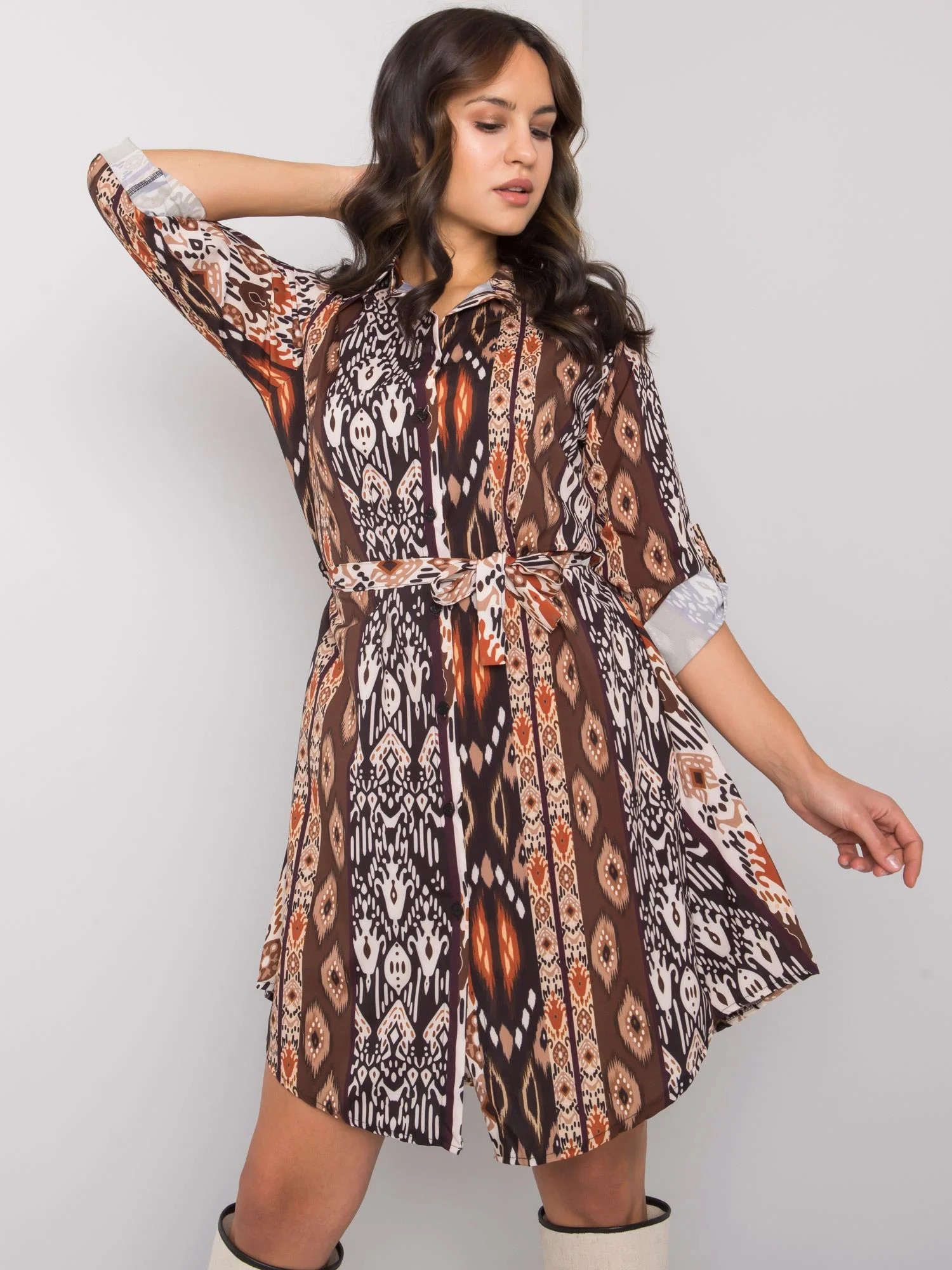 Modelka má na sobě velikost L. Rozměry modelky: výška 176 cm, prsa 100 cm, pas 79 cm, boky 101 cm.