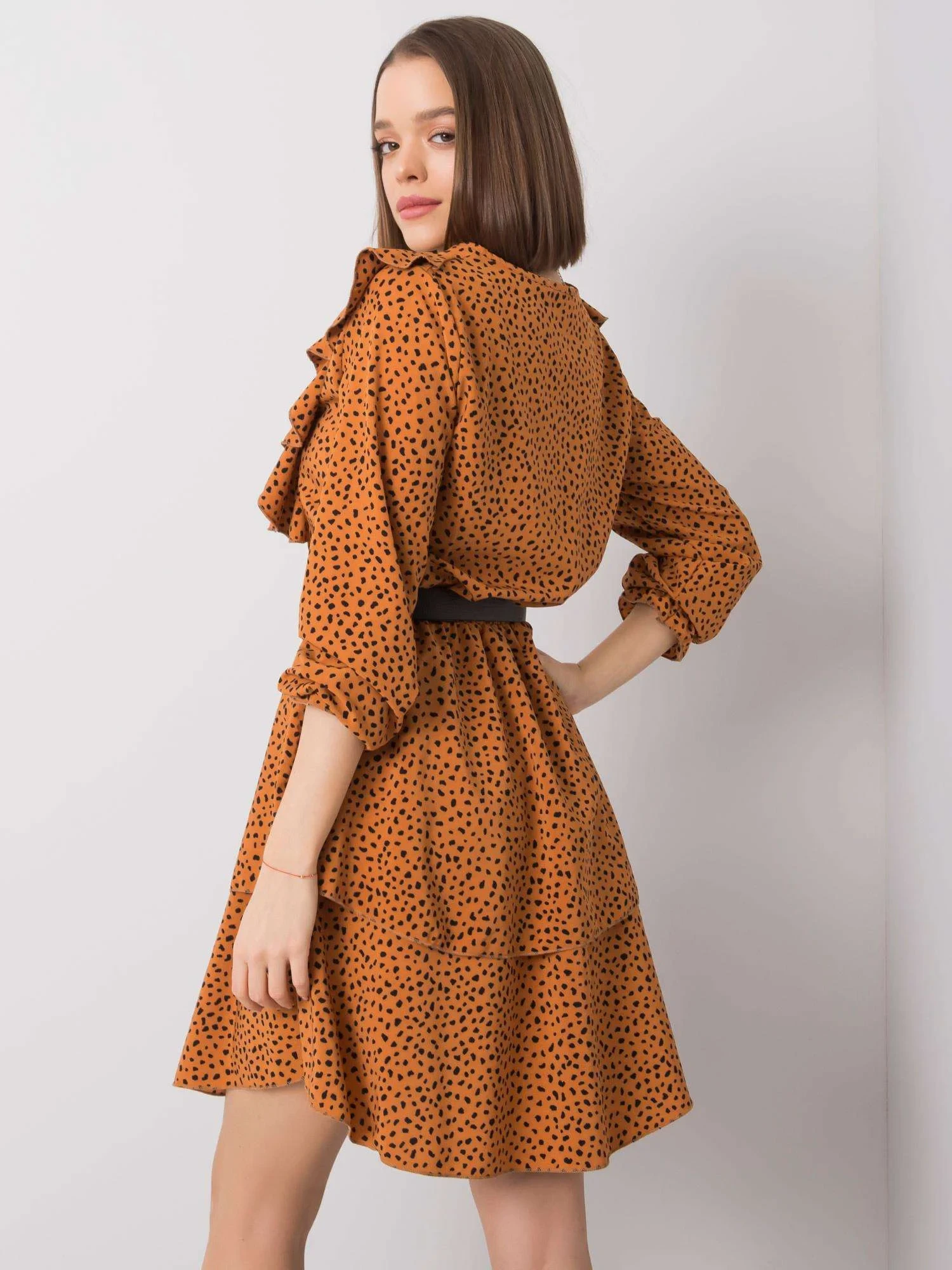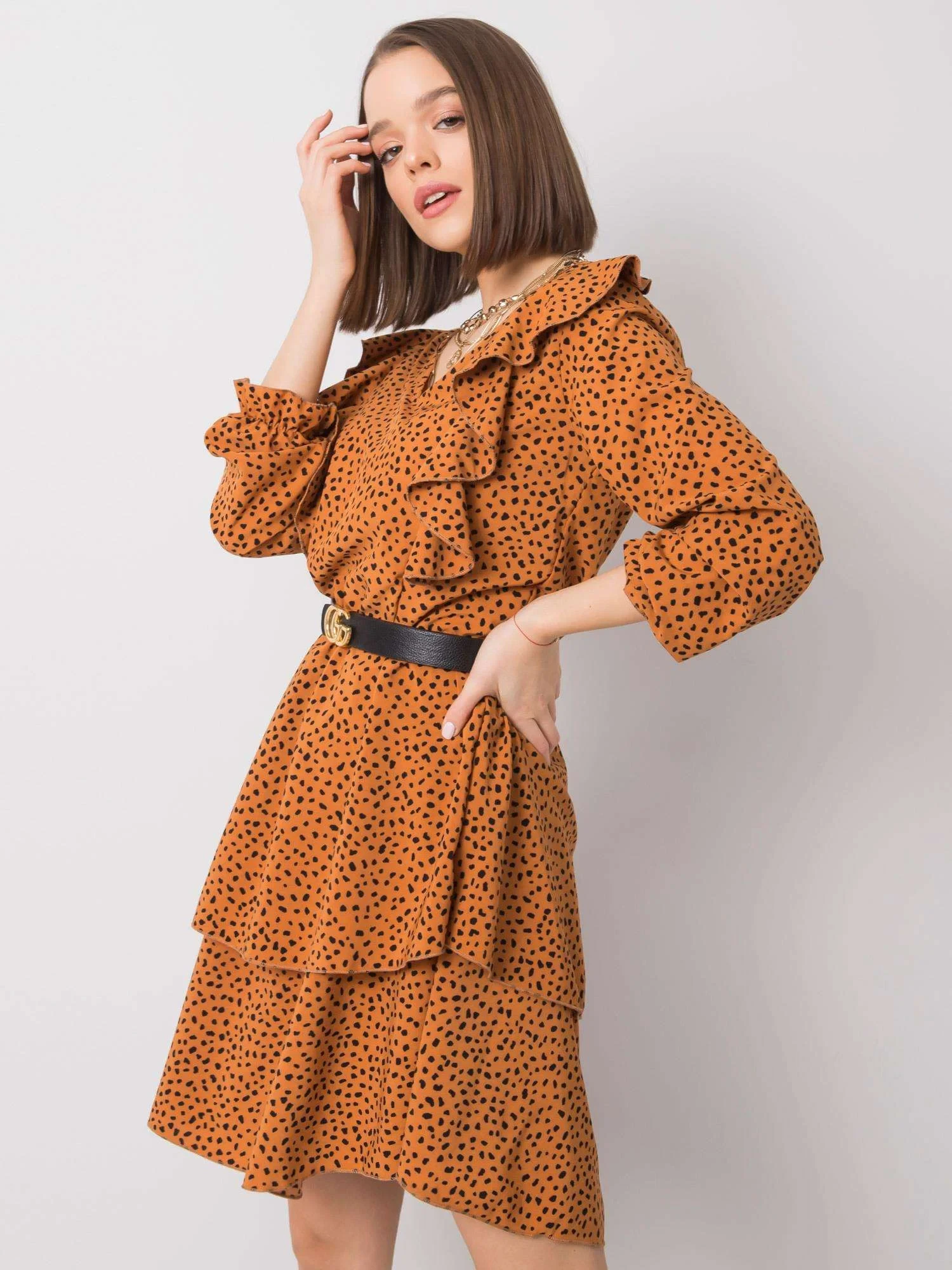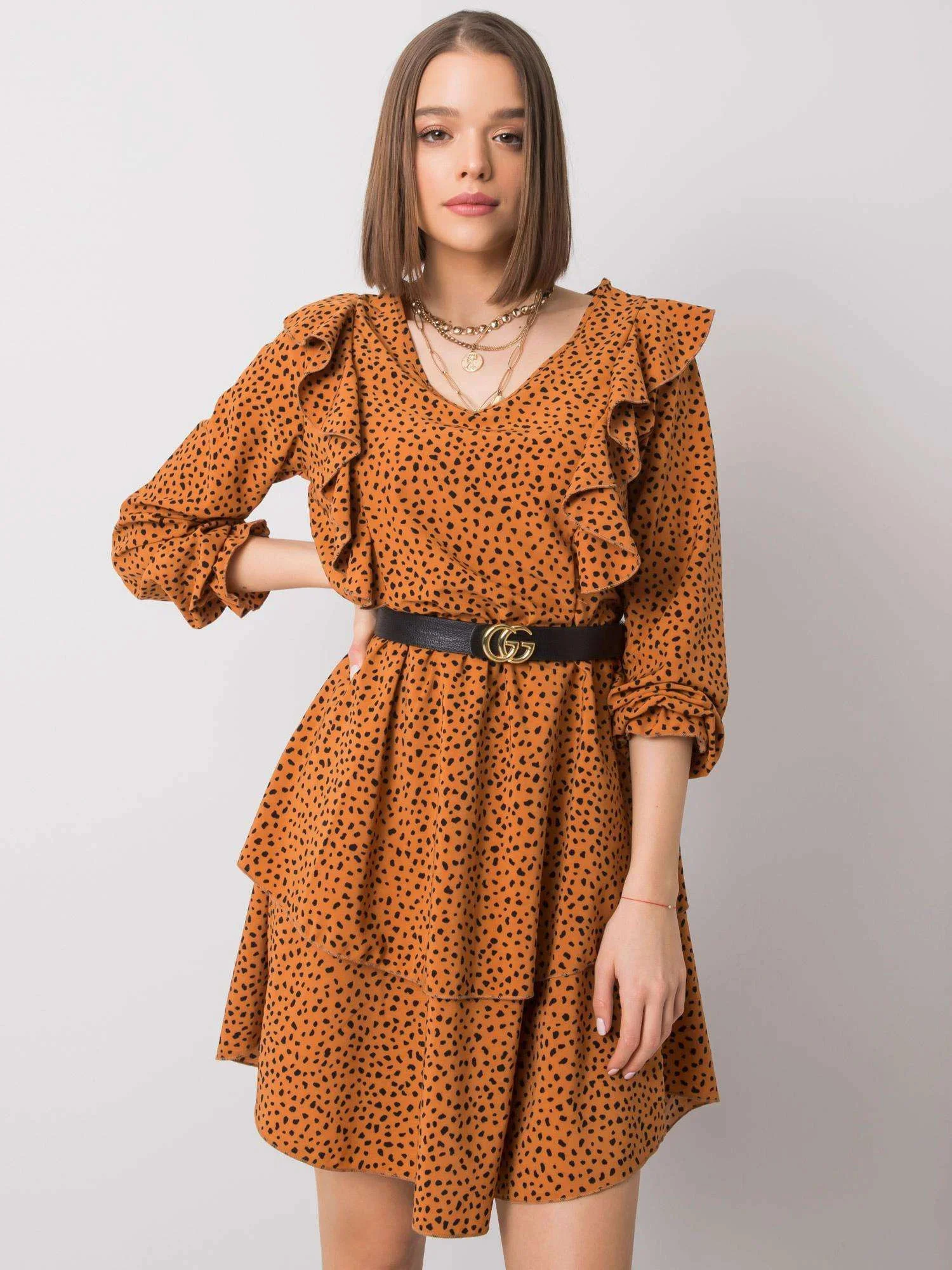 RUE PARIS Světle hnědé šaty s volánky.