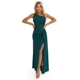 Maxi šaty na jedno rameno s leskem a rozparkem - lahvově zelené | Numoco - Polský výrobek