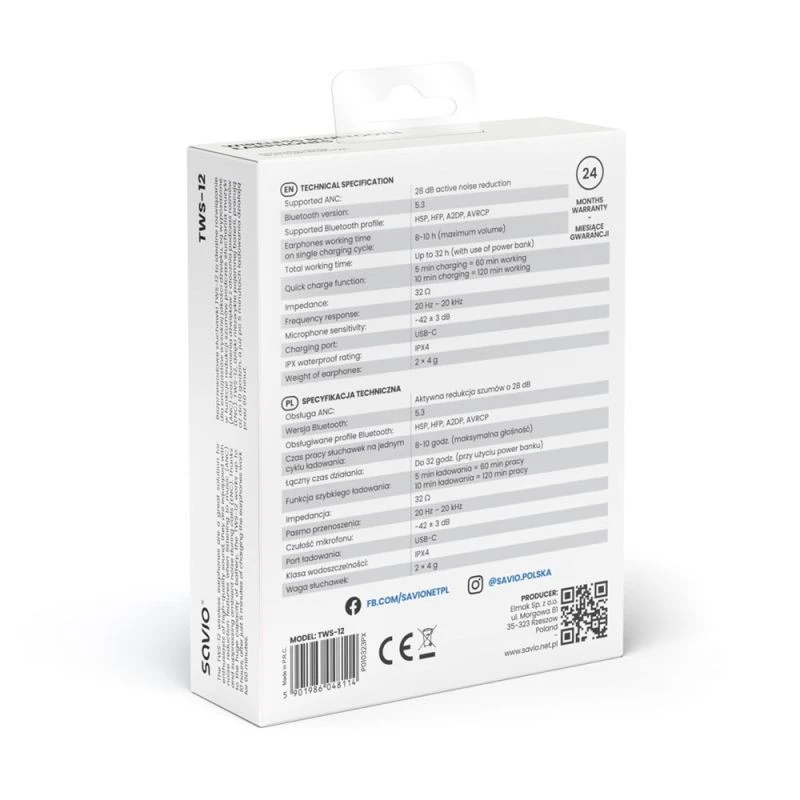 SAVIO BEZDRÁTOVÁ BLUETOOTH SLUCHÁTKA 5.3 S MIKROFONEM, ANC, ENC, QC TWS-12