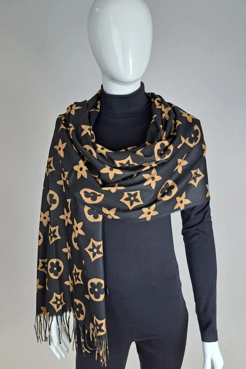 Krásný velký šátek v módním potisku se zlatými prvky. Model je ideální pro kabáty i jiné styly. Mimořádně měkká a na dotek příjemná tkanina.
