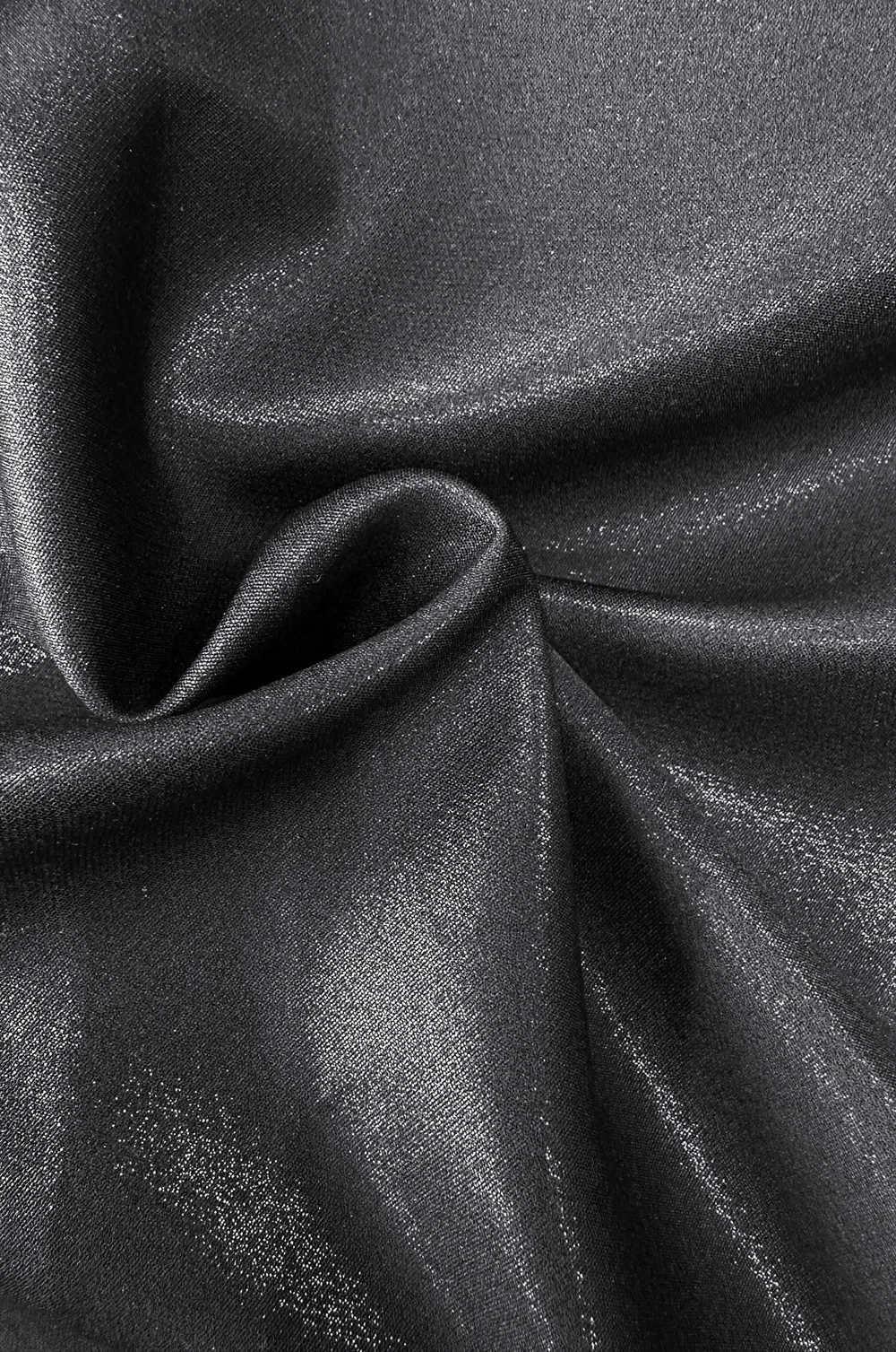 Šaty jsou ušité z černého materiálu s jemným brokátovým leskem. Přeložený obálkový výstřih pěkně zvýrazňuje dekolt a pásek v pase zvýrazňuje postavu. Model má malé rukávky a rozšířenou spodní část v délce midi, což dodává šatům lehkost a klasickou eleganci. Šaty jsou polským výrobkem a jsou vhodné pro výjimečné příležitosti.