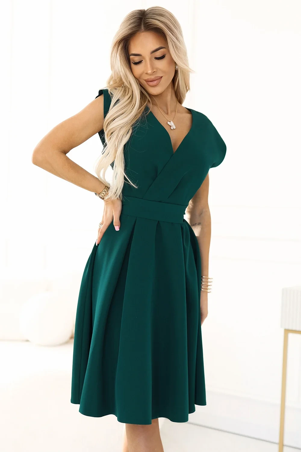 SCARLETT Zelené rozšířené dámské šaty s přeloženým obálkovým výstřihem model 20864405 - numoco