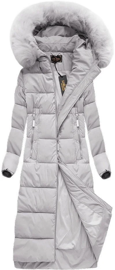 Šedá dlouhá dámská zimní bunda s kapucí (7688BIG)