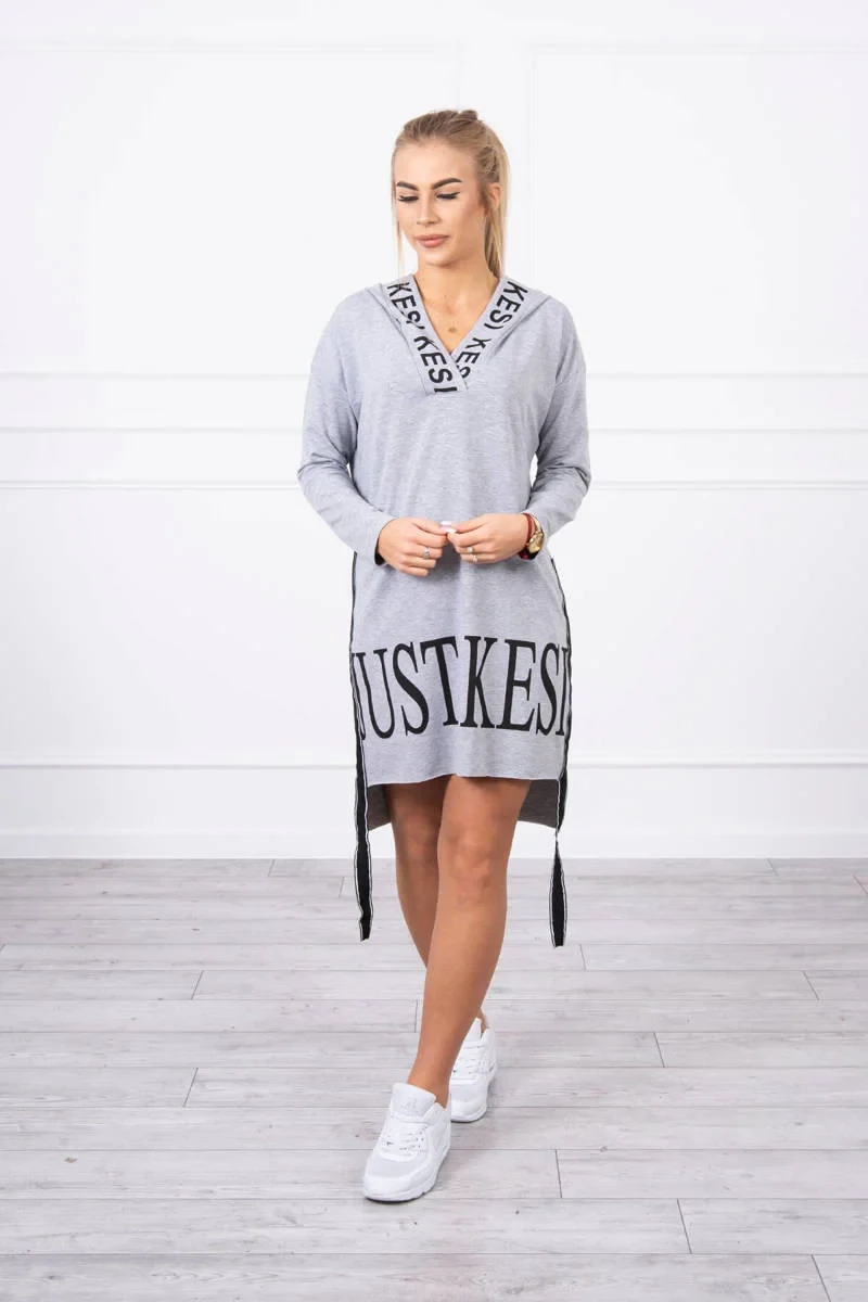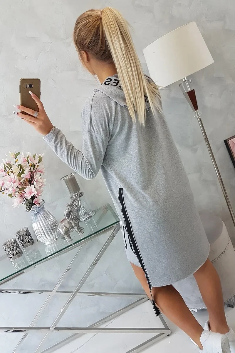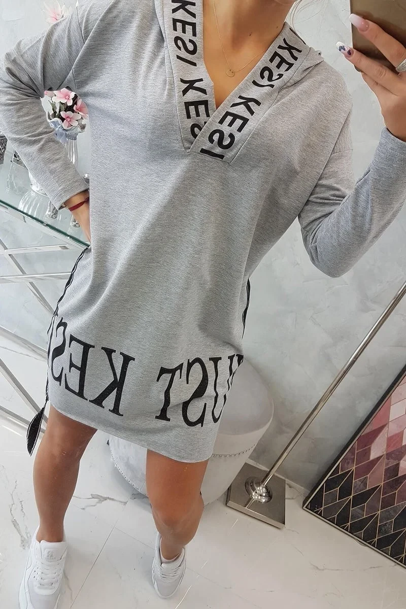 Šedé šaty s kapucí a potiskem