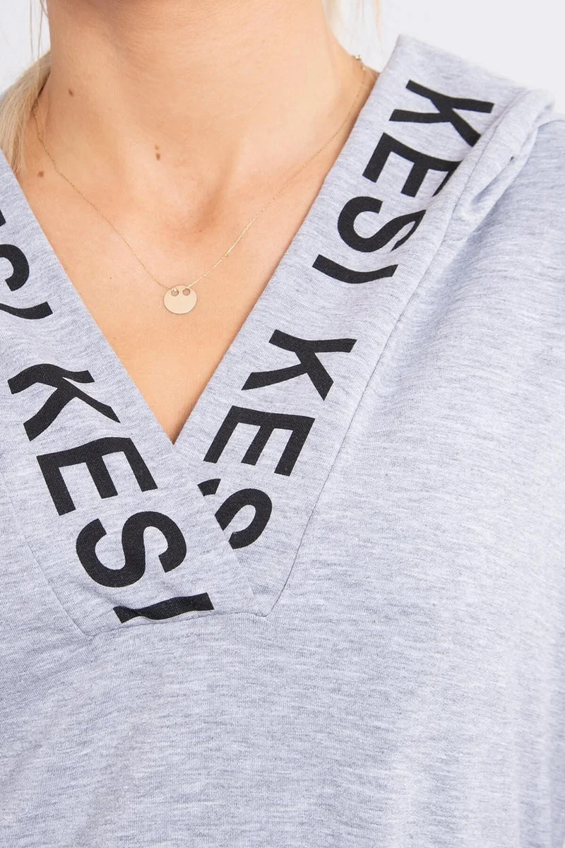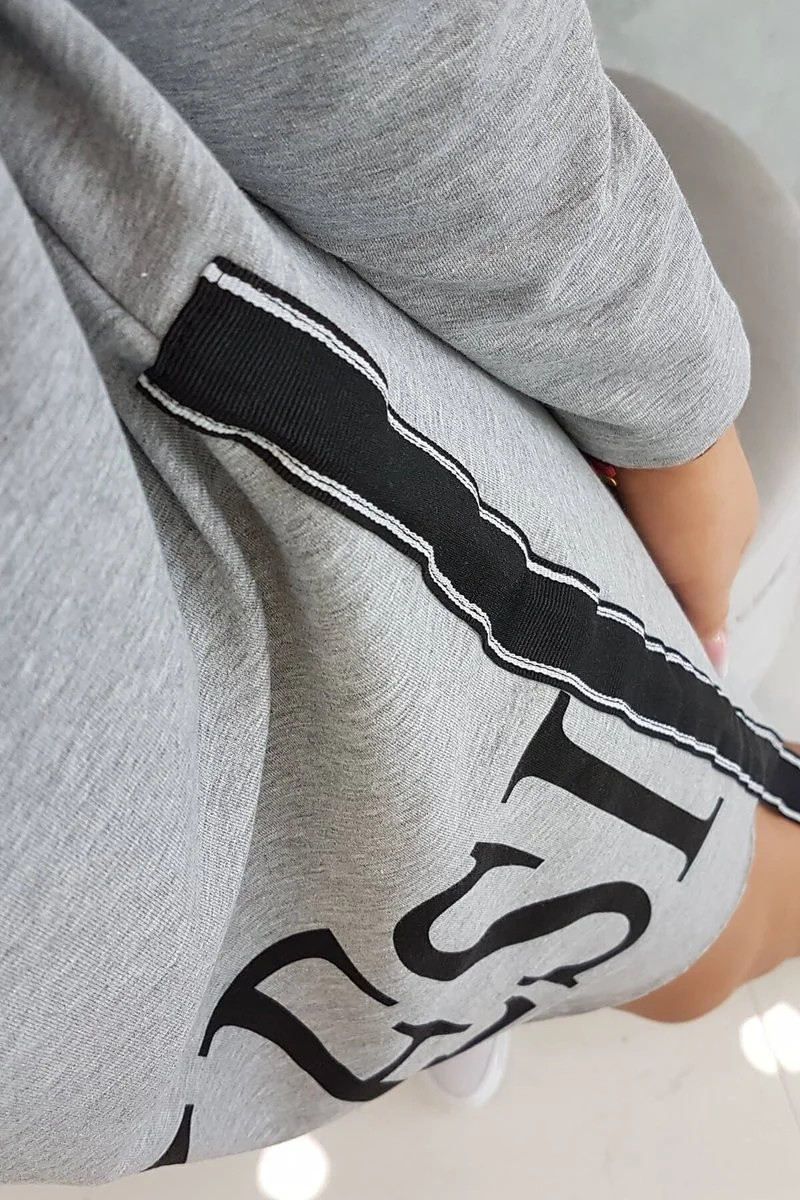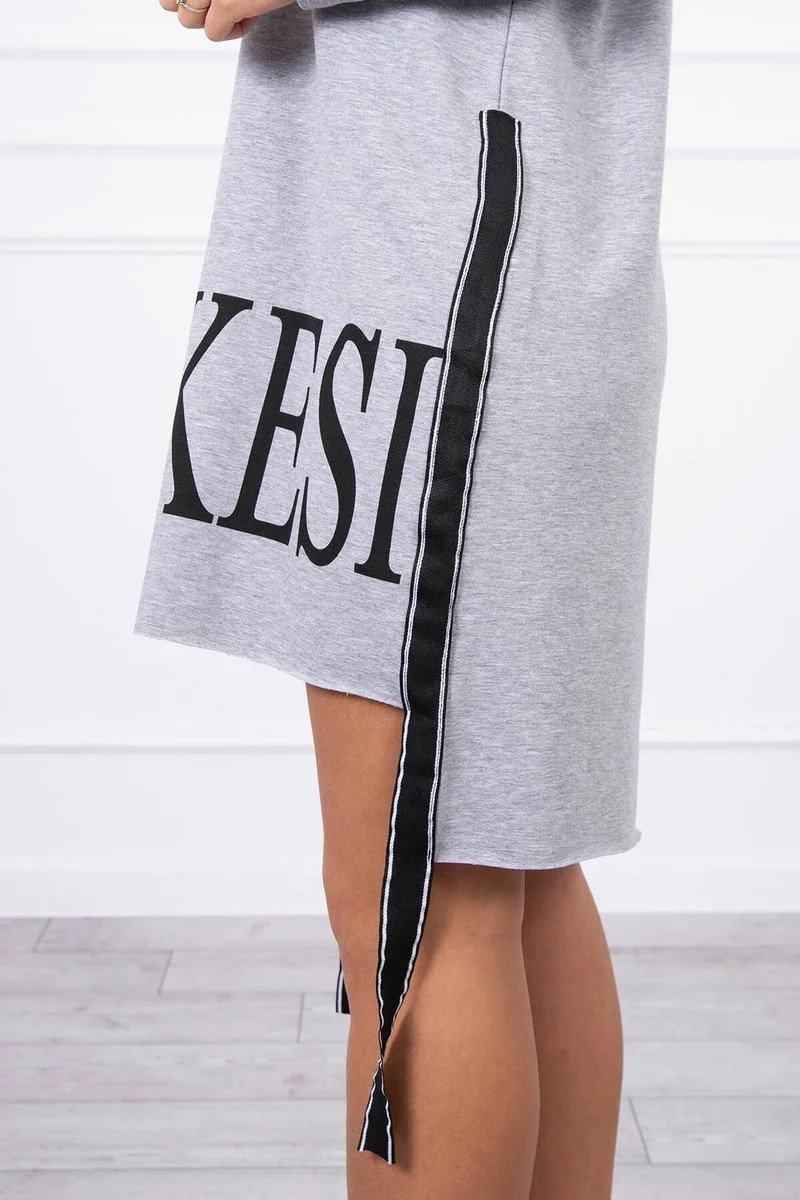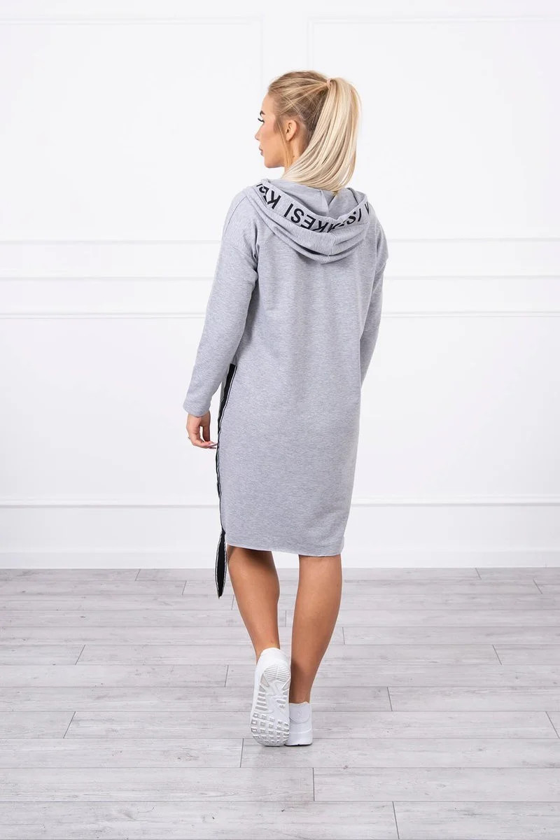 Šedé šaty s kapucí a potiskem