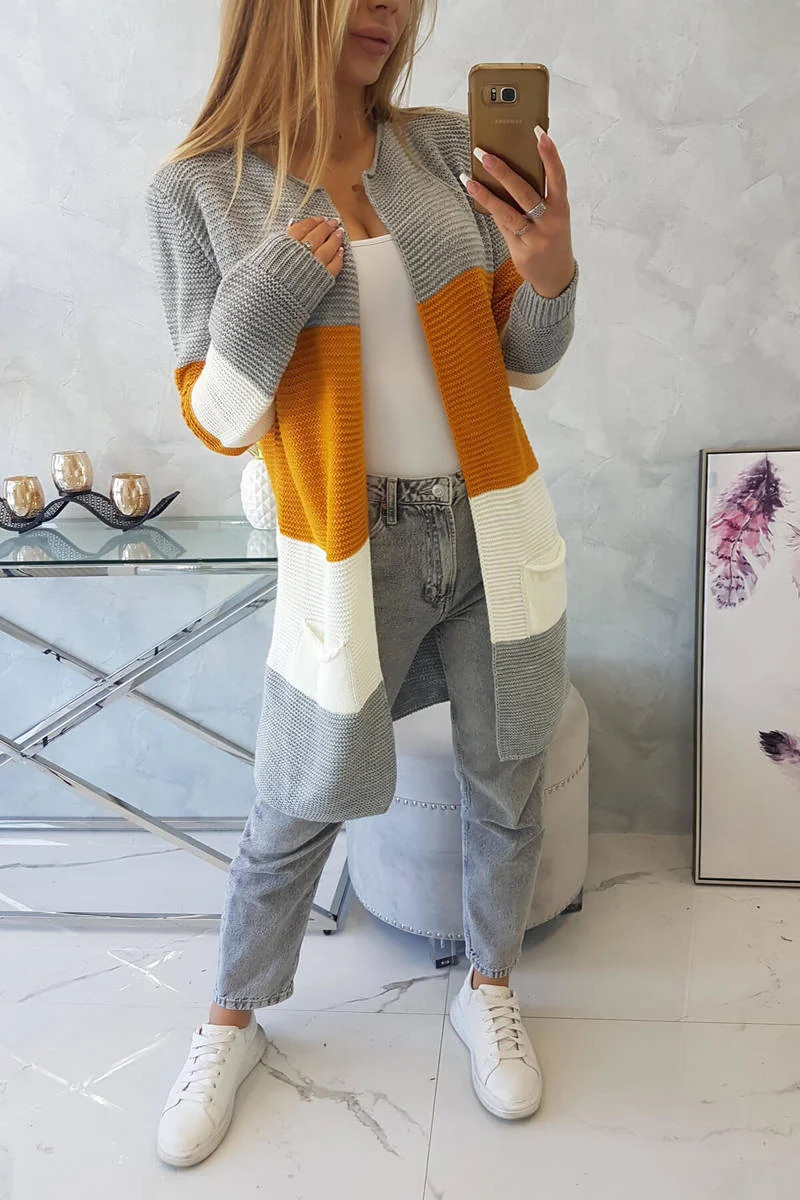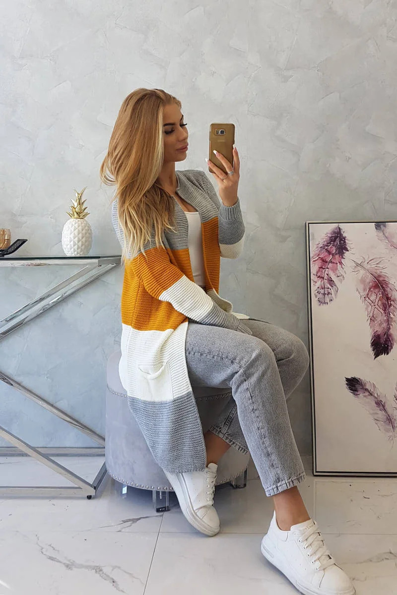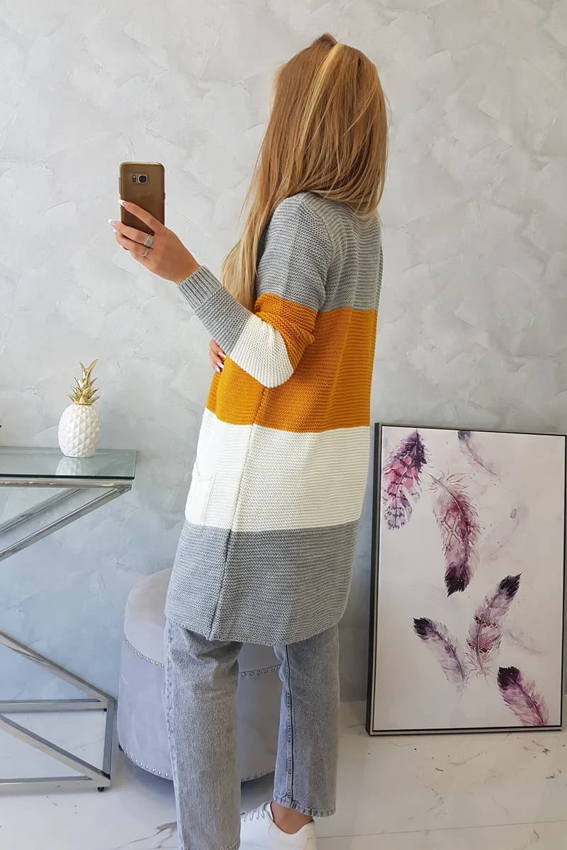 Představujeme vám dlouhý svetr se širokými pruhy. Svetr s dlouhým rukávem a rozepínáním. Na přední straně má dvě praktické kapsy. Velmi módní kombinace barev. Ideální pro jakýkoli styl. Svetr je vyroben z vysoce kvalitního materiálu. Velikost je univerzální a vyhovuje dámám ve velikostech M, L, XL.