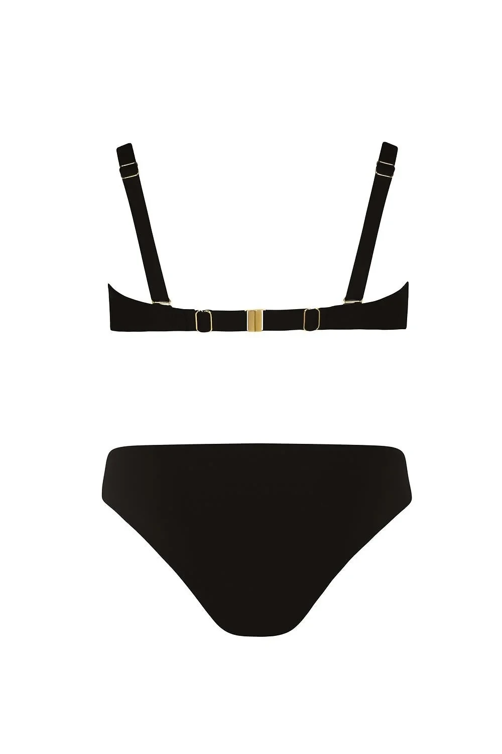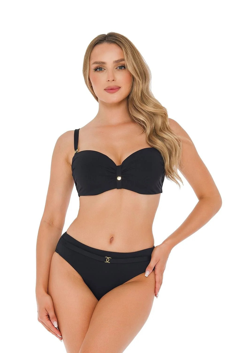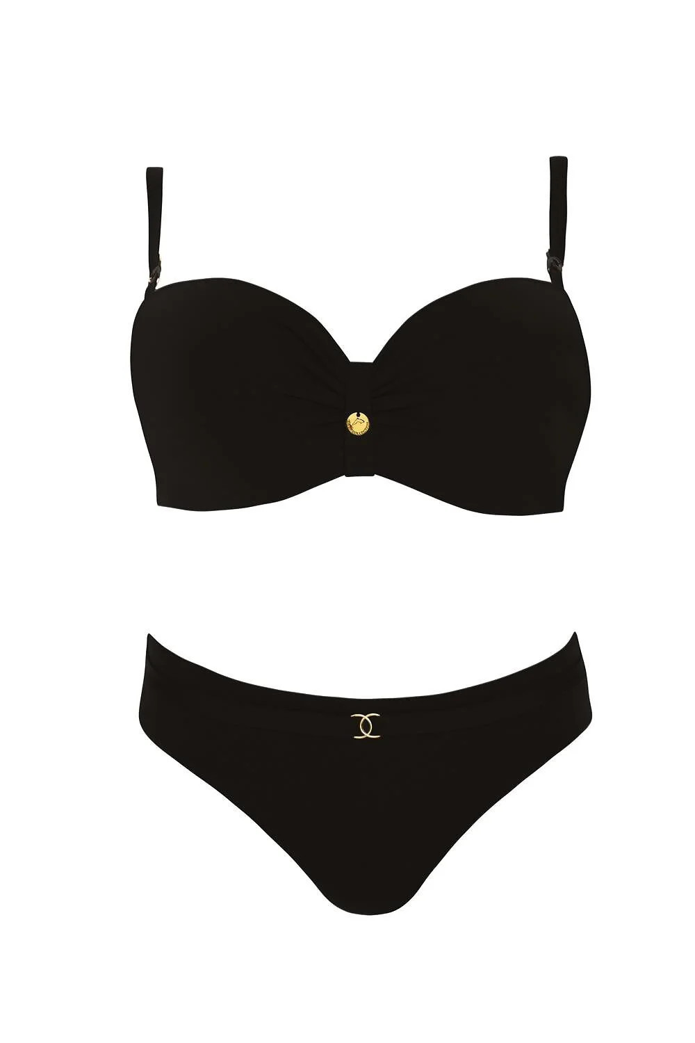 Plavky, dvoudílné - hladká podprsenka, s vyztuženými košíčky, s kosticemi - push-up ve velikostech: 36C/D, 38B/C, 40C,42B - odepínací, nastavitelná ramínka, zdobená zlatými prvky - zadní část s nastavitelným obvodem, zapínání na klips- hladké kalhotky, zdobené páskem a bižuterním prvkem