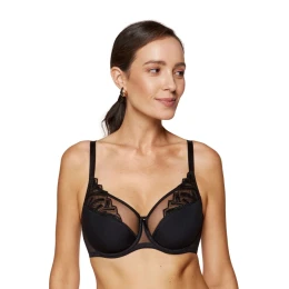 Podprsenka s polovztyčenými v černé barvě. Spodní část košíčků je vyrobena z tenkého korzetového pěnového materiálu a horní část z lesklého háčku, díky čemuž se podprsenka skvěle přizpůsobí tvaru prsou. Skvěle se hodí pro asymetrii. Spodní část košíčků je vybavena vnitřní bavlnou s certifikátem OEKO-TEX, díky čemuž jsou šetrné k pokožce. Lesklá ozdoba mezi košíčky. Svislé boční kostice stabilizují obvod podprsenky. Podprsenka je navržena a ušita v Polsku.