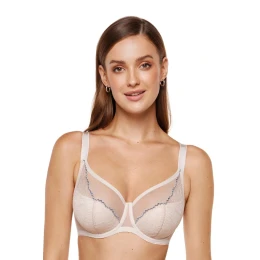 Podprsenka okouzlí jemnou, lesklou krajkou a decentní modrou lemovkou, která krásně zdůrazňuje tvar misek. Harmonické spojení elegance a lehkosti způsobuje, že model efektně zdůrazňuje poprsí. Dolní část misek je vyrobena z tenkého korzetového pěnového materiálu, zatímco vršek zdobí decentní, lesklá krajkou, která jemně leží na prsou a zajistí ideální přizpůsobení jejich tvaru. Jemná, kontrastní modrá lemovka podél linie misek zdůrazňuje jejich tvar a dodává celku svěží, moderní charakter. Konstrukce podprsenky se skvěle osvědčuje při asymetrii prsou, zajišťuje estetický vzhled a pohodlné nošení. Svislé boční kostice efektivně stabilizují obvod podprsenky, zlepšují podporu a trvanlivost konstrukce. Dolní část misek je vybavena vnitřní bavlnou s certifikátem OEKO-TEX, díky čemuž je šetrná k pokožce. Zadní část z elastického tylu. Nastavitelné není odnímatelné ramínka. Podprsenka byla navržena a ušita v Polsku.