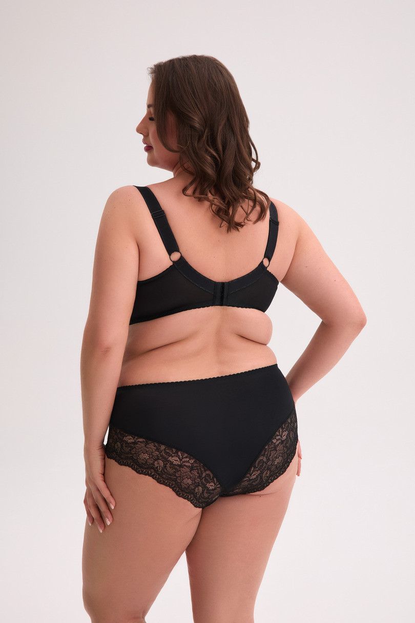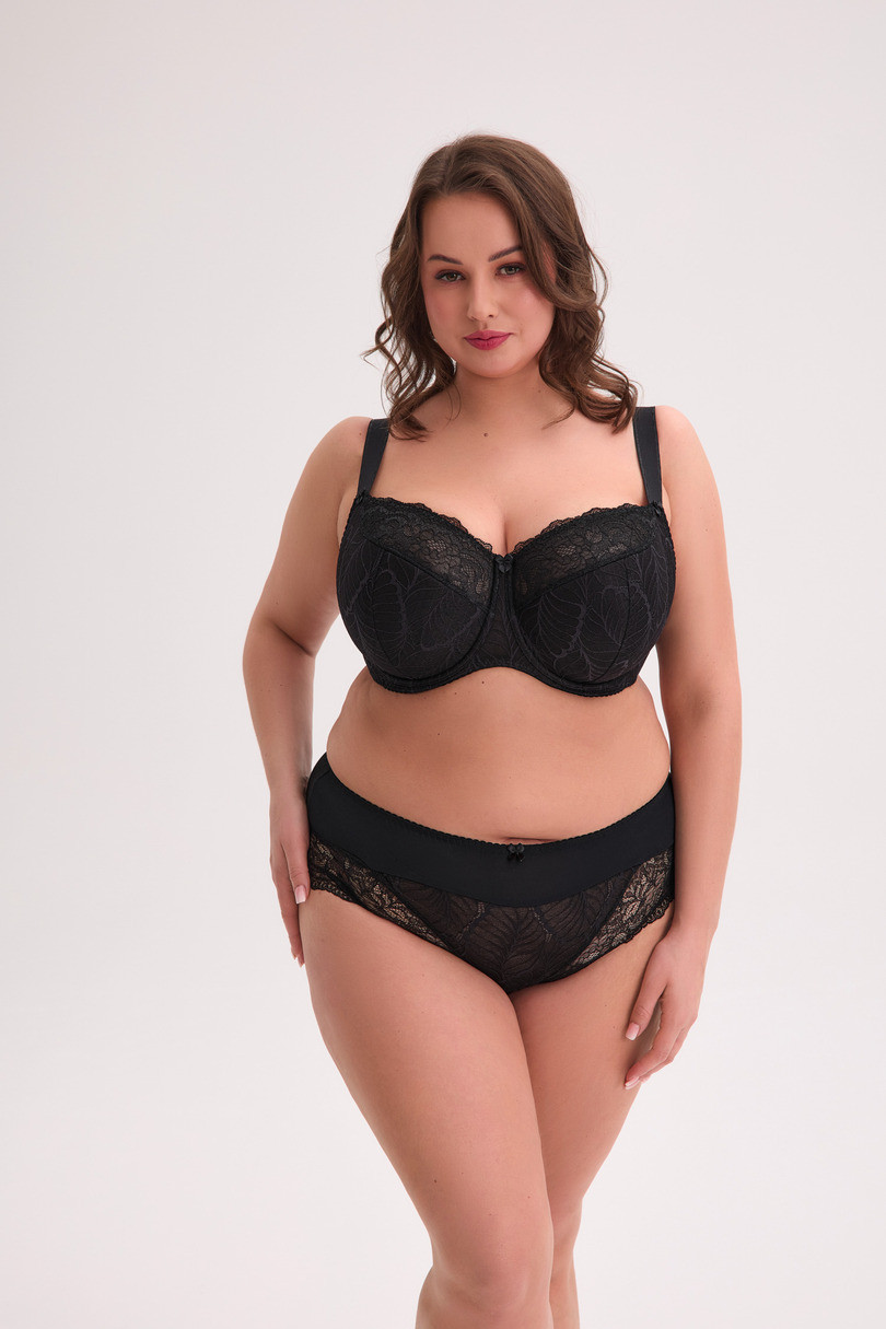 Biustonosz na konstrukcji SS10MX to perfekcyjne połączenie elegancji, komfortu i funkcjonalności, stworzone specjalnie z myślą o kobietach z pełniejszym biustem. Górna część miseczki została wykonana z elastycznej koronki podszytej tiulem, co zapewnia idealne dopasowanie do kształtu piersi. Dolna część miseczki, środek oraz boczki wykonano z elastycznego plenu, który stabilizuje konstrukcję i pięknie modeluje sylwetkę. Plecy natomiast wykonane są ze sprężystej lycry, która dyskretnie dopasowuje się do ciała i gwarantuje swobodę ruchów. Stylowy wzór koronki i subtelna kokardka między miseczkami dodają całości zmysłowego uroku.