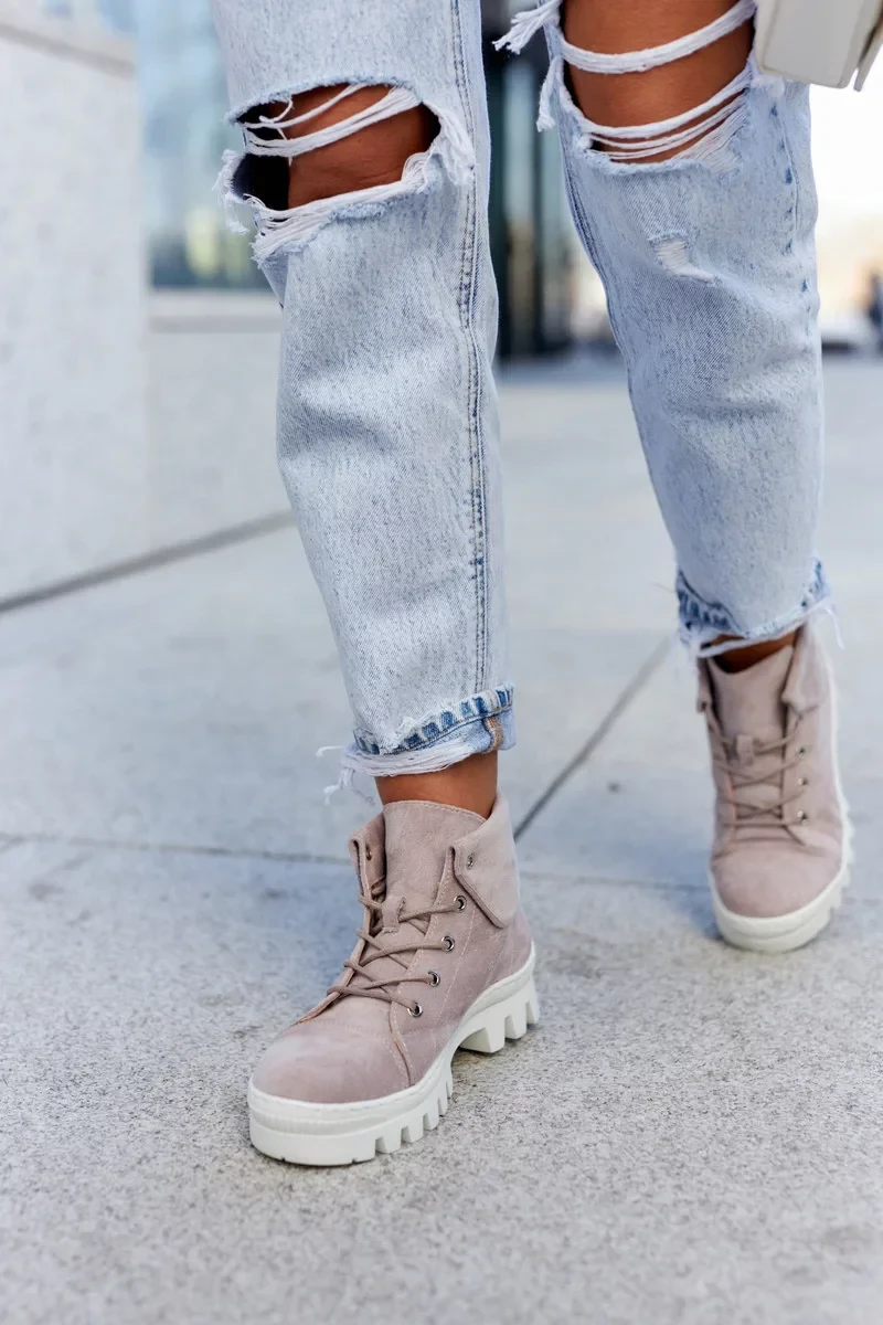 Trappery jsou vyrobeny z ekologického semiše s kulatým zavazováním na tkaničky. Jsou nasazeny na tlusté podrážce s módními výřezy v podrážce. Tuhá, zaoblená špička. Svršek ke kotníku, který je navíc mírně prohnutý. Skvělé boty pro ležérní styling. Mají měkkou stélku z ekokůže a vyztuženou patu. Perfektní boty na jaro, musíte je mít! Při výběru velikosti použijte tabulku velikostí.