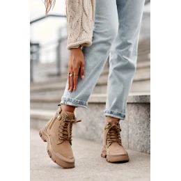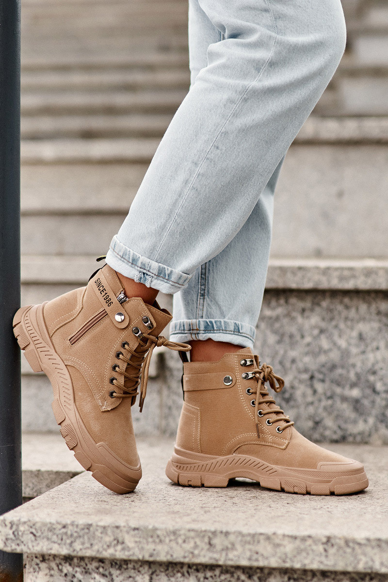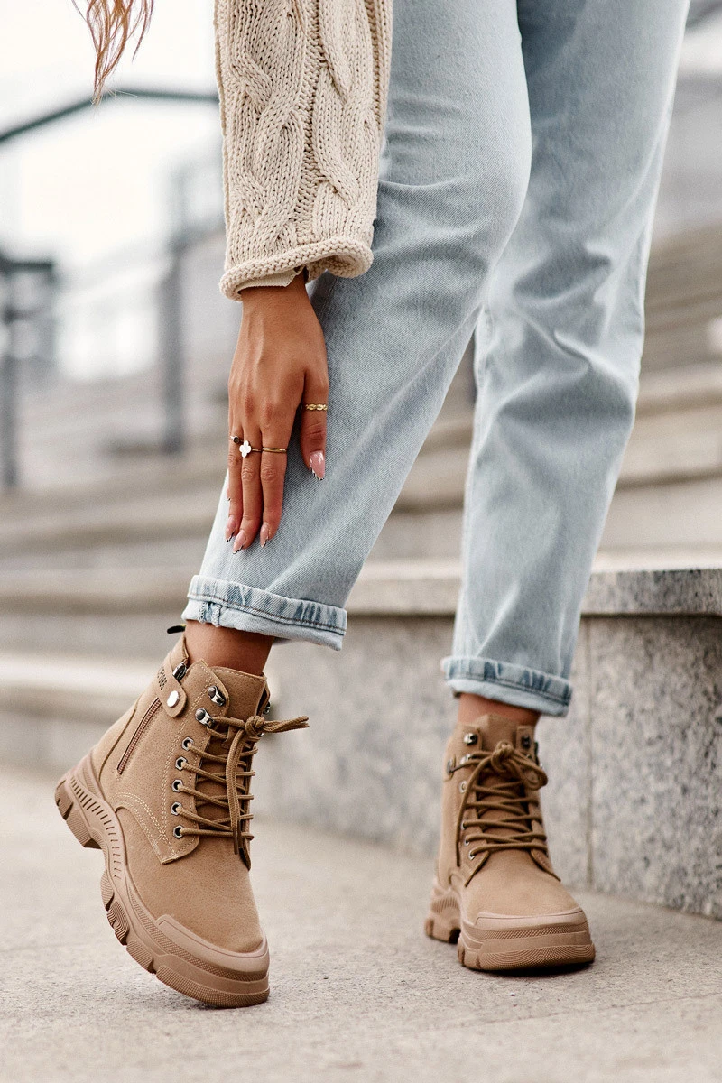 Dámské trapery jsou umístěny na plochém podpatku a platformě. Vyrobeno z eko semiše. Zapíná se na zip po vnější straně kotníku a ještě šněrování. Špička je zesílená, nosky jsou zaoblené. Masivní podešev a plochý podpatek zajišťují stabilitu při používání na nerovném povrchu. Při výběru velikosti se řiďte tabulkou velikostí.