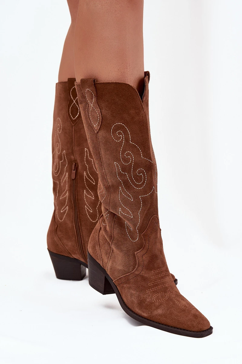 Dámské kozačky v kovbojském stylu jsou mimořádně moderní obuv na jarně-jižní sezónu. Vyrobena z přírodního semiše. Stabilní, nízký podpatek zajišťuje, že jsou pohodlné a ideální na nošení každý den. Model se zasouváním s dodatečným zapínáním na zip usnadňuje obutí bot. Svršek sahá před koleno. Kožená, měkká stélka zajistí pohodlí během nošení. Tyto kozačky skvěle ladí s různými stylizacemi. Určitě by měly být součástí vašeho šatníku! Při výběru velikosti se řiďte tabulkou velikostí.