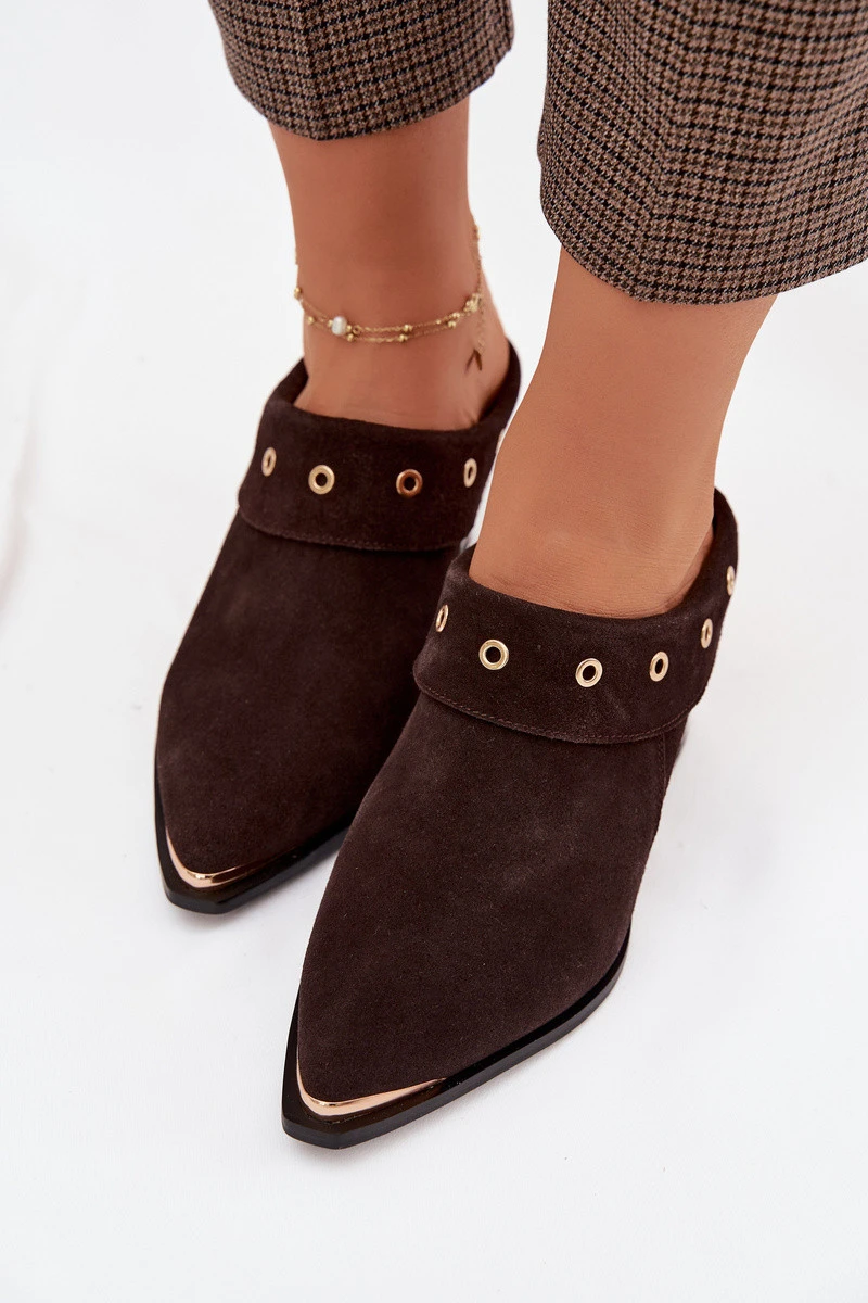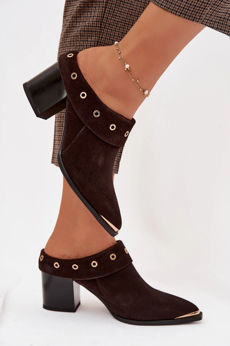 Dámské nazouváky vyrobené z přírodního semiše jsou výjimečnou volbou pro ženy, které mají rády módní akcenty inspirované stylem western. Měkká kůže dodává botám elegantní vzhled a zajišťuje pohodlí při nošení, takže model je ideální na zvláštní příležitosti. Charakteristickým prvkem je ohnutá horní část, která zdůrazňuje originální tvar a dodává jedinečný styl. Špičaté nosy zdobené zlatým detailem přinášejí jemný, elegantní akcent, opticky zeštíhlující nohu. Boty jsou postaveny na stabilním sloupkovém podpatku, který zajišťuje pohodlí při chůzi a jemně zvýrazňuje siluetu. Tyto působivé nazouváky s večerním charakterem skvěle doplní outfity s šaty, sukněmi nebo elegantními kalhotami. Při výběru velikosti se řiďte tabulkou velikostí.