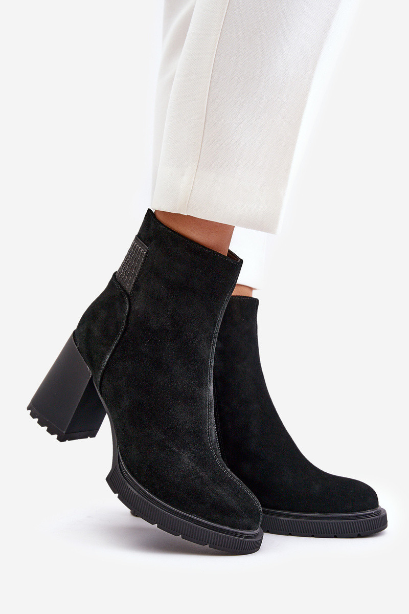 Elegantní boty vyrobené z přírodní semiše jsou ideální volbou na chladnější dny. Uloženy na stabilním sloupkovém podpatku, poskytují pohodlí při nošení po celý den. Vnitřek je zateplený obuvnickou vlnou, což zaručuje teplo a pohodlí i v mrazivých dnech. Díky praktickému zapínání na zip je obouvání a svlékání rychlé a snadné. Při výběru velikosti se řiďte tabulkou velikostí.