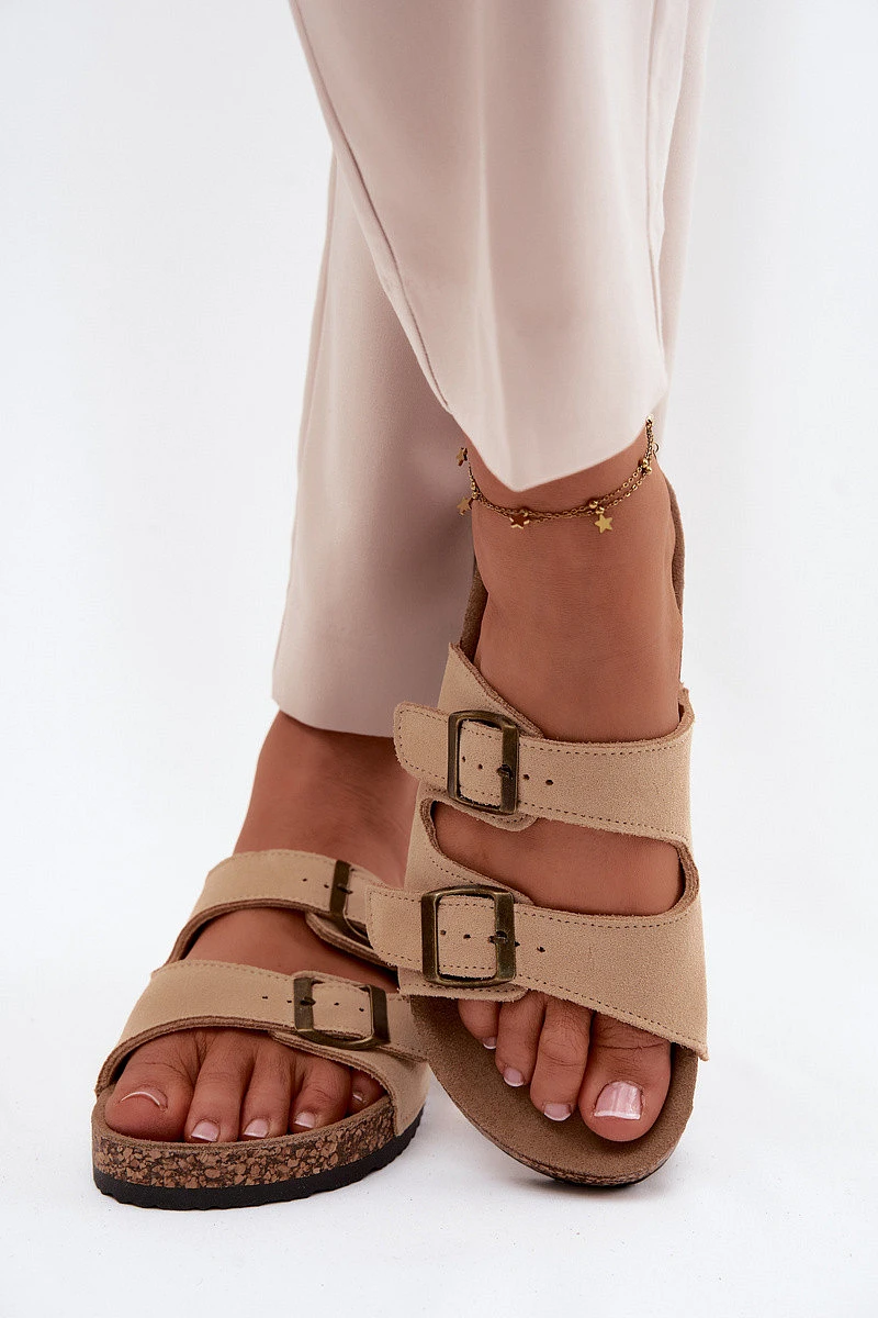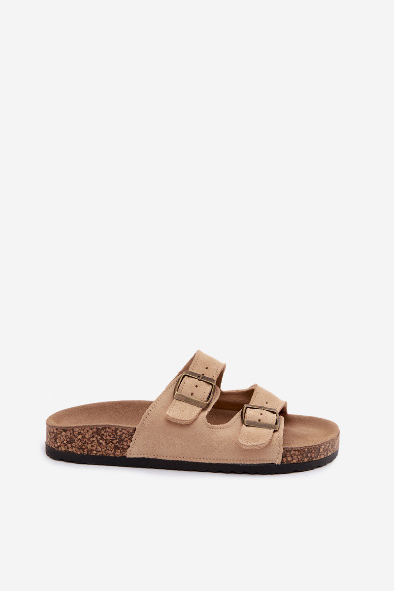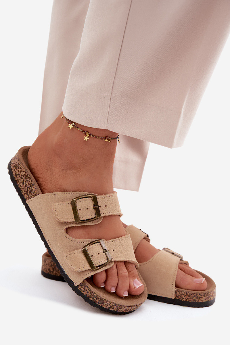 Semišové pantofle na korkové podrážce s přezkami béžové model 22120824 - Boto