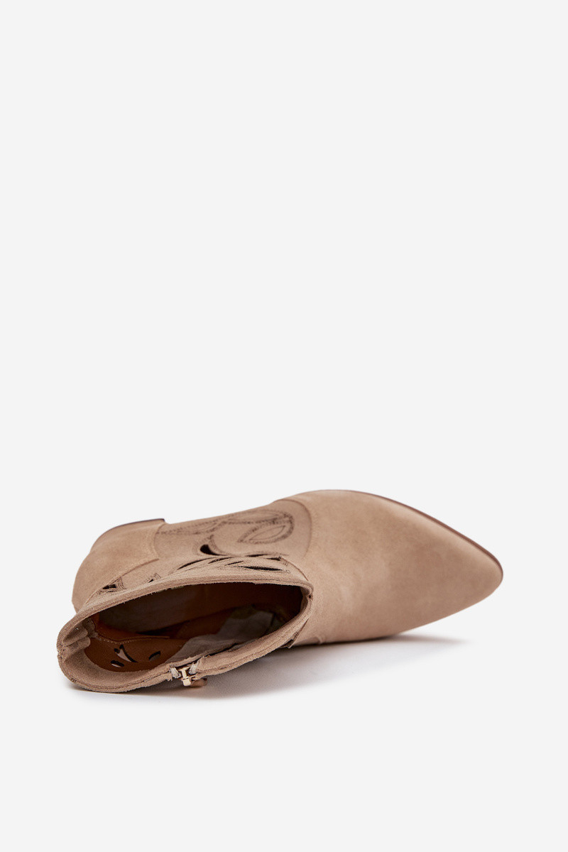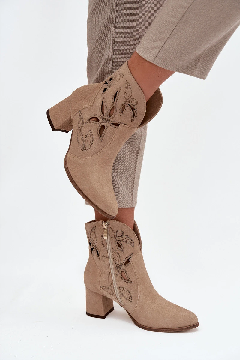 Semišové perforované dámské kotníkové boty na podpatek Zazoo 3647 béžové