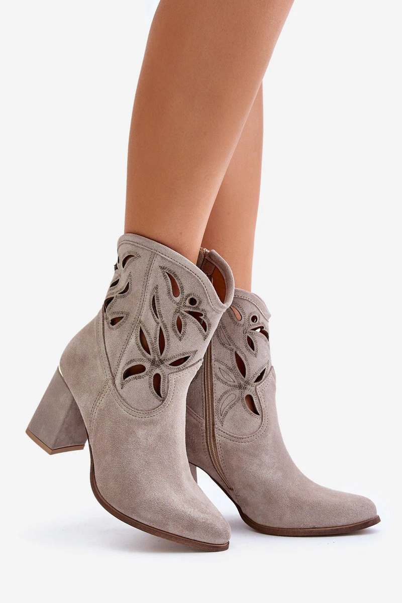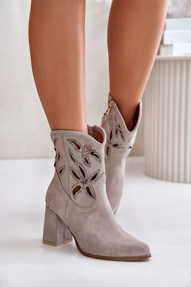 Módní, perforované kotníkové boty na sloupkovém podpatku. Vyrobeno z vysoce kvalitní přírodní nubukové kůže. Hlavní předností tohoto modelu je perforovaný vzor na svršku. Zapínání na zip. Špičaté špičky opticky prodlouží nohy. Měkká, velmi pohodlná stélka je vyrobena z přírodní kůže. Skvělý model pro mnoho stylizací! Při výběru velikosti se řiďte tabulkou velikostí.