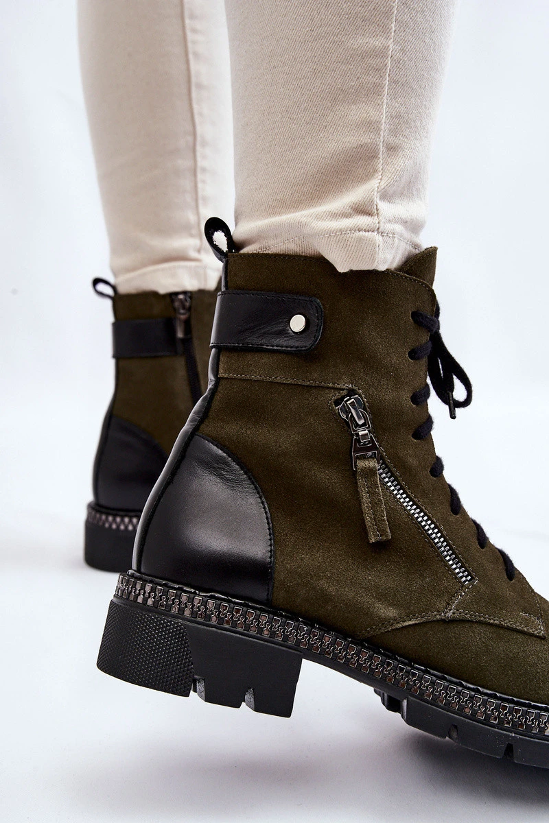 Klasické, dámské kozačky jsou vyrobeny z vysoce kvalitní přírodní kůže. Tento model má zip na boku svršku a pevné šněrování. Kozačky jsou nasazeny na plochém podpatku s drážkami a protiskluzovou podrážkou. Uvnitř zateplené přikrývkou na boty. Zpevněná pata zajistí správnou stabilizaci chodidla. Při výběru velikosti se řiďte tabulkou velikostí.