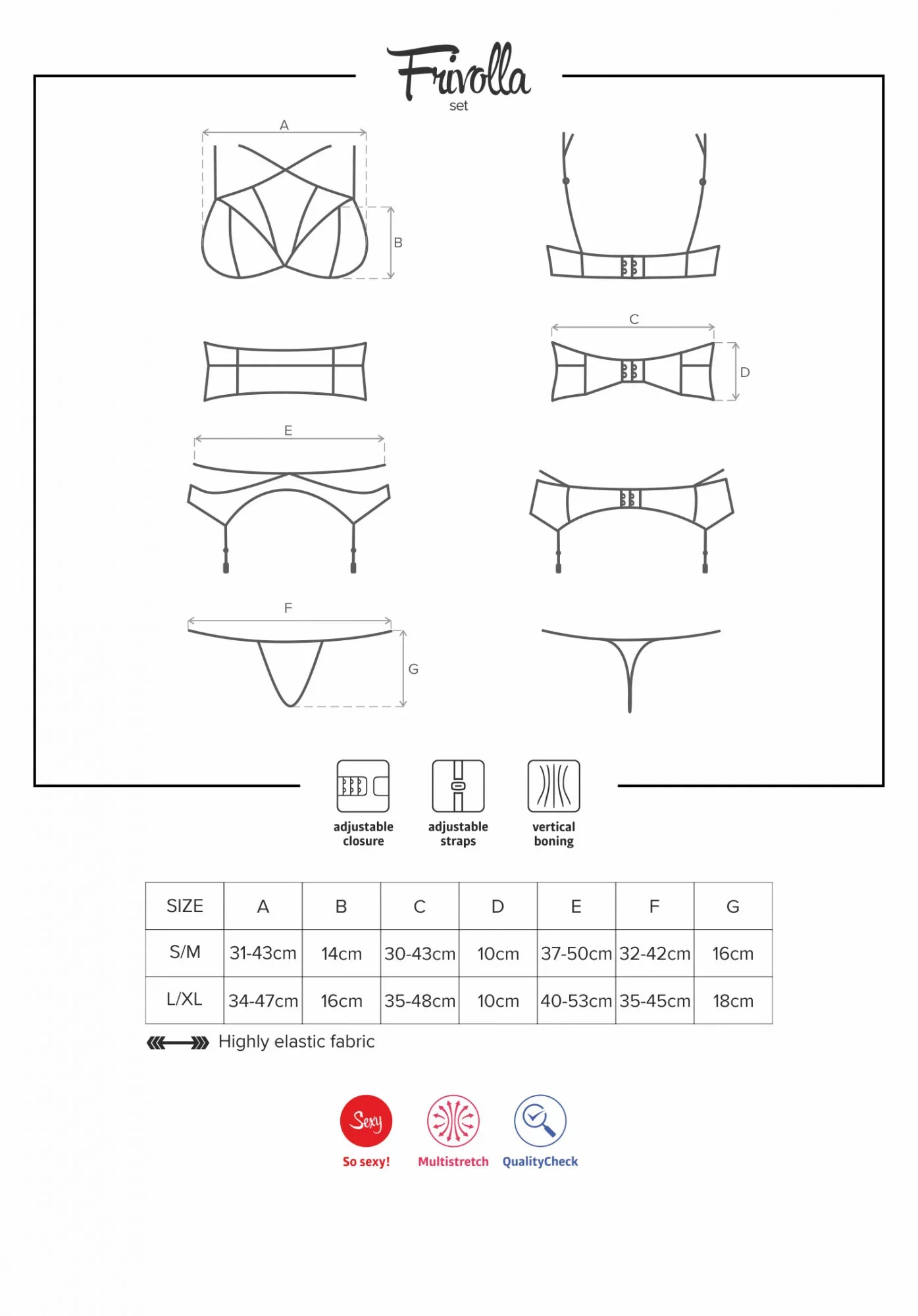 Neuvěřitelně nádherný a svůdný set. Pokryje vaše tělo dokonale jemnou krajkou s hravými proužky – od krku až po hýždě. Seznamte se s Frivolla setem! Čtyři obdivuhodné kousky prádla k vám přichází se svým zvláštním kouzlem. Naprosto jedinečný design s koketní krajkou a pásky vám umožní stát se sexy svůdnicí. Takže? Stačí jen obléci a prožít ty vzrušující chvíle, které na vás čekají!