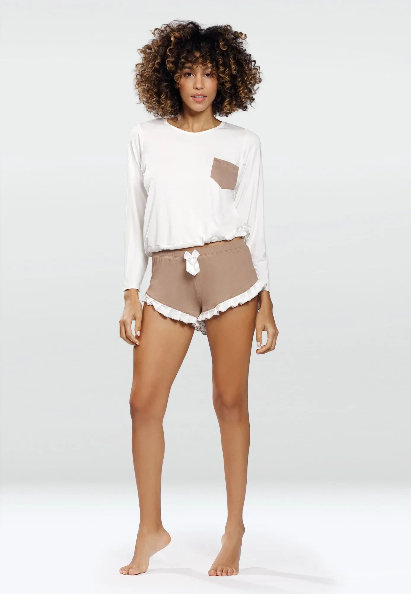 Dvoudílná souprava, která se bude hodit jako pyžamo i jako domácí oblečení. Vyrobena z viskózy, příjemné na dotek. Halenka s dlouhými rukávy, zdobená náprsní kapsou. Ve spodní části halenky je tunýlek se stuhou, kterou lze zavázat na mašli. Šortky s půvabným volánkem kolem stehen. Barevné provedení cappuccino v kombinaci se sladkým ecru, velmi pěkné. Měkký úplet, příjemný na dotek. 92 % viskóza, 8 % elastan.