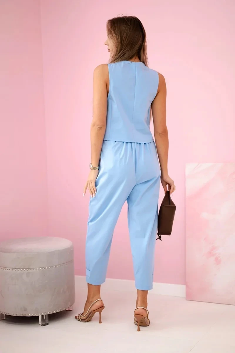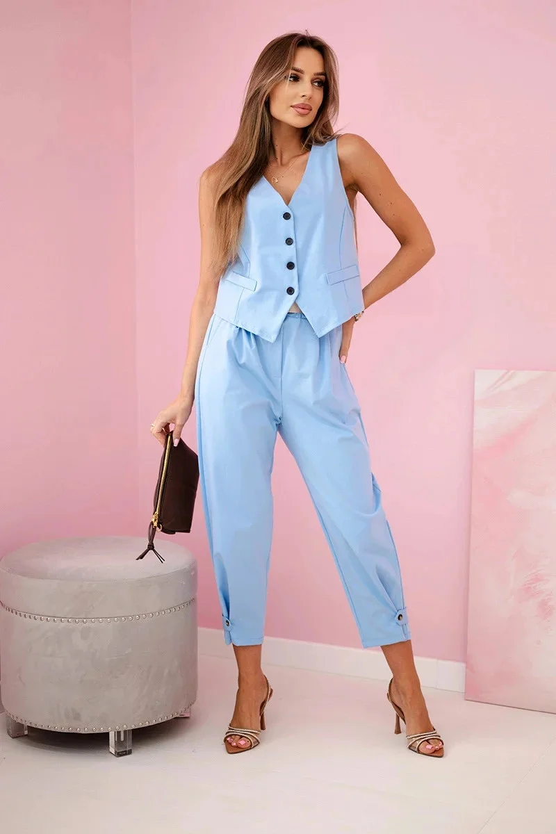 Tato jedinečná souprava spojuje klasickou eleganci s módním minimalismem a vytváří tak dokonalý outfit pro každou příležitost. Vesta s precizním střihem jemně zvýrazňuje siluetu a dodává outfitu sofistikovaný vzhled, zatímco její univerzální design umožňuje nosit ji samostatně nebo v kombinaci s košilí či halenkou. Kalhoty doplňují soupravu a zajišťují pohodlné nošení a dokonalé přizpůsobení postavě. Díky pečlivému zpracování a kvalitním materiálům poskytuje tato souprava celodenní komfort a hodí se jak pro každodenní outfity, tak i pro elegantnější příležitosti. Vyberte si soupravu vesta + kalhoty a vytvořte stylový, moderní vzhled, který podtrhne vaši sebejistotu a vkus. Velikost je univerzální a odpovídá ženám nosícím velikosti S, M nebo L.