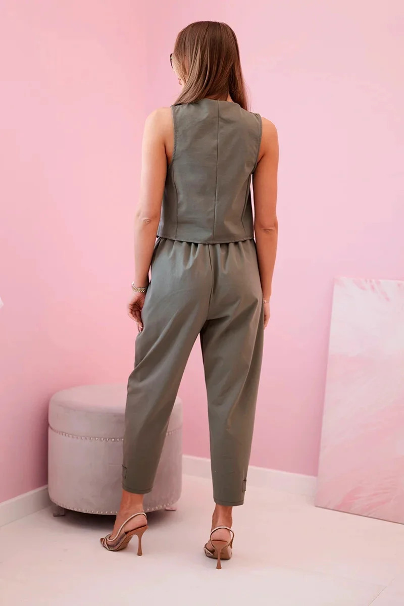 Tato jedinečná souprava spojuje klasickou eleganci s módním minimalismem a vytváří tak dokonalý outfit pro každou příležitost. Vesta s precizním střihem jemně zvýrazňuje siluetu a dodává outfitu sofistikovaný vzhled, zatímco její univerzální design umožňuje nosit ji samostatně nebo v kombinaci s košilí či halenkou. Kalhoty doplňují soupravu a zajišťují pohodlné nošení a dokonalé přizpůsobení postavě. Díky pečlivému zpracování a kvalitním materiálům poskytuje tato souprava celodenní komfort a hodí se jak pro každodenní outfity, tak i pro elegantnější příležitosti. Vyberte si soupravu vesta + kalhoty a vytvořte stylový, moderní vzhled, který podtrhne vaši sebejistotu a vkus. Velikost je univerzální a odpovídá ženám nosícím velikosti S, M nebo L.