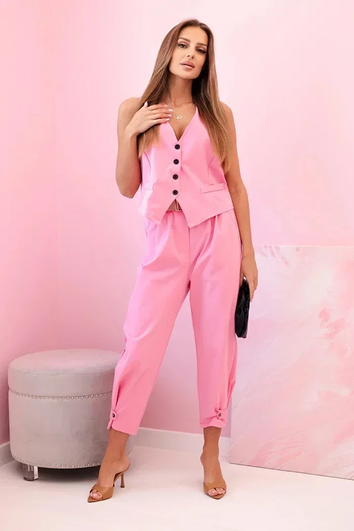 Tato jedinečná souprava spojuje klasickou eleganci s módním minimalismem a vytváří tak dokonalý outfit pro každou příležitost. Vesta s precizním střihem jemně zvýrazňuje siluetu a dodává outfitu sofistikovaný vzhled, zatímco její univerzální design umožňuje nosit ji samostatně nebo v kombinaci s košilí či halenkou. Kalhoty doplňují soupravu a zajišťují pohodlné nošení a dokonalé přizpůsobení postavě. Díky pečlivému zpracování a kvalitním materiálům poskytuje tato souprava celodenní komfort a hodí se jak pro každodenní outfity, tak i pro elegantnější příležitosti. Vyberte si soupravu vesta + kalhoty a vytvořte stylový, moderní vzhled, který podtrhne vaši sebejistotu a vkus. Velikost je univerzální a odpovídá ženám nosícím velikosti S, M nebo L.
