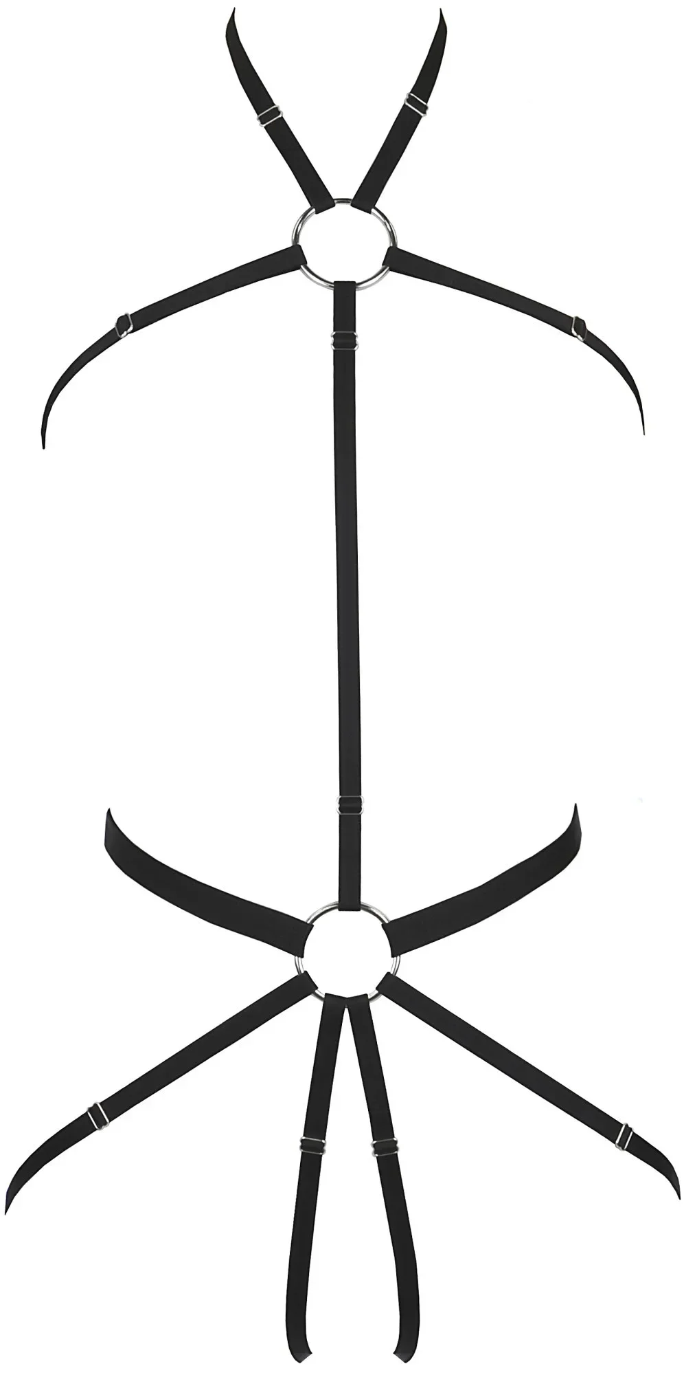 Černé žebrované popruhy jsou nádherným detailem, který rozpaluje smysly! Na pokožce vypadá krásně a vytváří na ní malebný a zajímavý vzor nepravidelných křížících se linií. Může doplnit jakoukoli sadu, např. v-9861, V-9863 podprsenka. Nastavitelný postroj s velkým kruhem stříbrné barvy uprostřed.