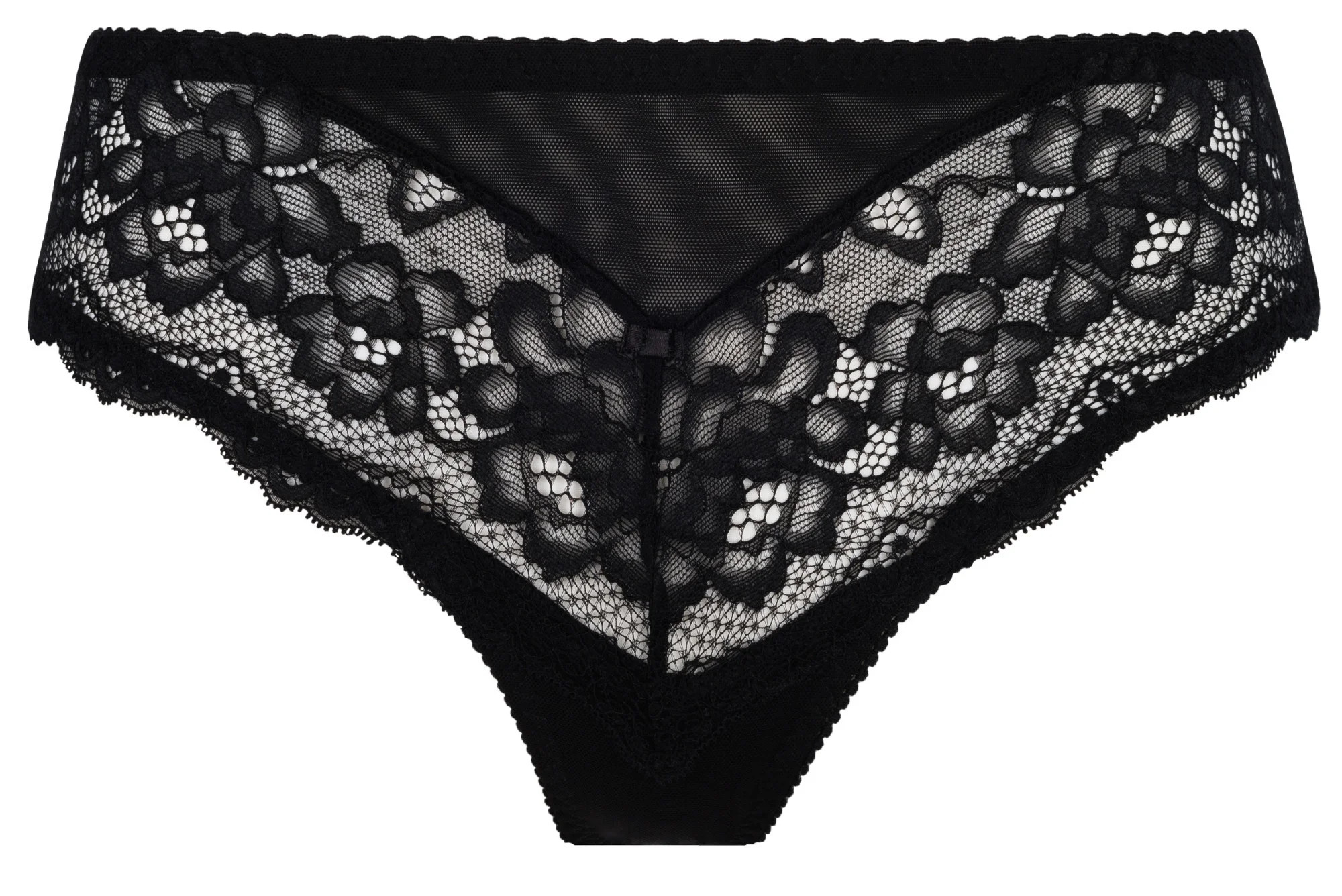 Sexy černé kalhotky Zaina V-7603 to je povinný doplněk k podprsence V-7601. Jsou vyrobené z jemné krajky s trojúhelníkovými tylovými vsadkami. Móda kalhotek je velmi smyslná a okouzlující. Dokonale zdůrazní oblost vašich boků. Jemné vykrojení na zadní straně kalhotek s malou mašličkou dodává celé kompozici na koketnosti. Materiálové složení: Polyamid 79 %, bavlna 12 %, elastan 9 %