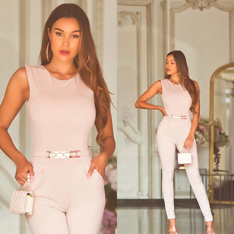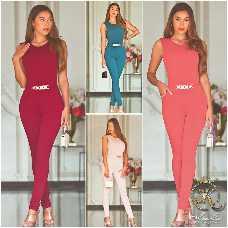 Dámský overal bez rukávů, s dlouhými kalhotami. Vepředu polopásek s pozlacenou sponou.