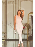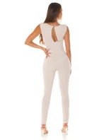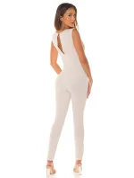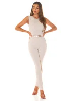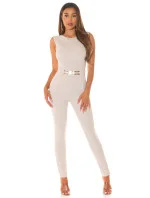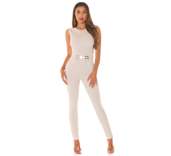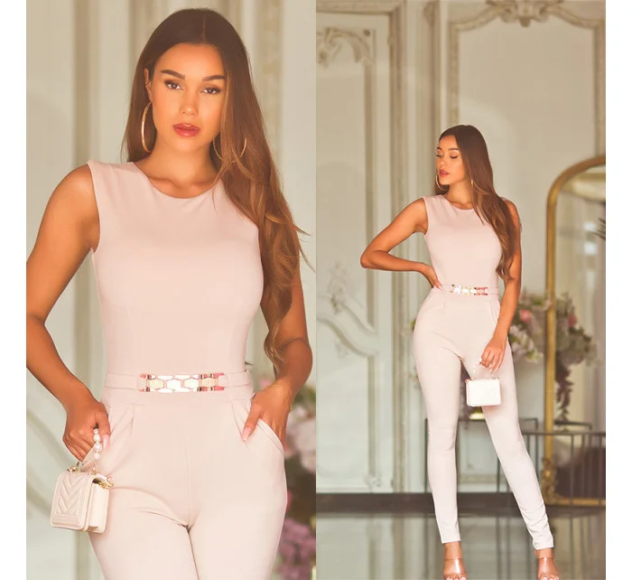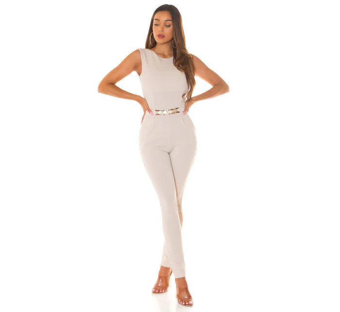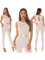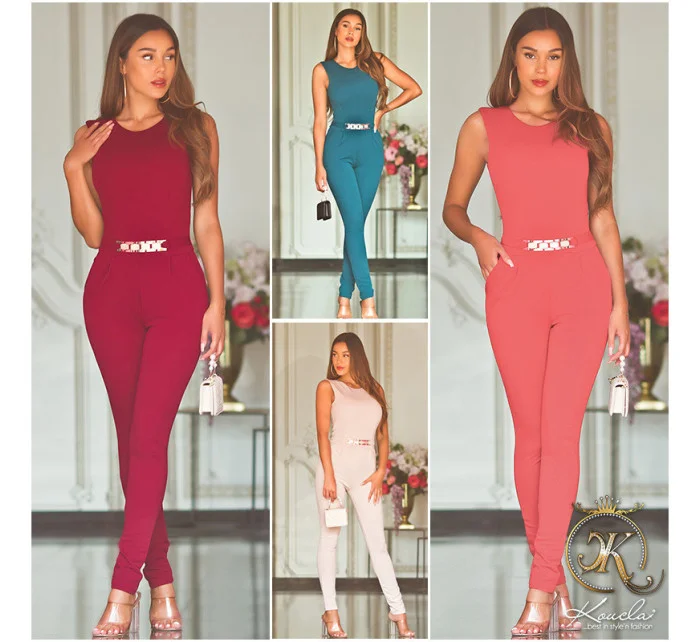 Dámský overal bez rukávů, s dlouhými kalhotami. Vepředu polopásek s pozlacenou sponou.
