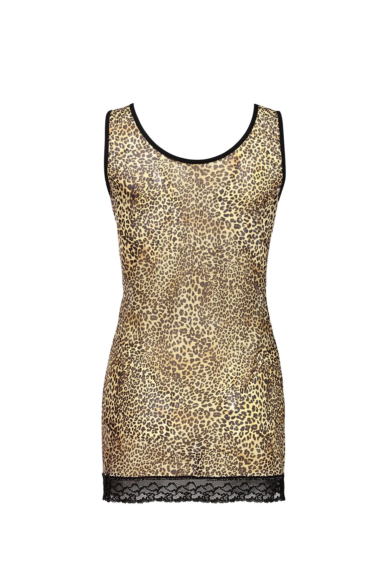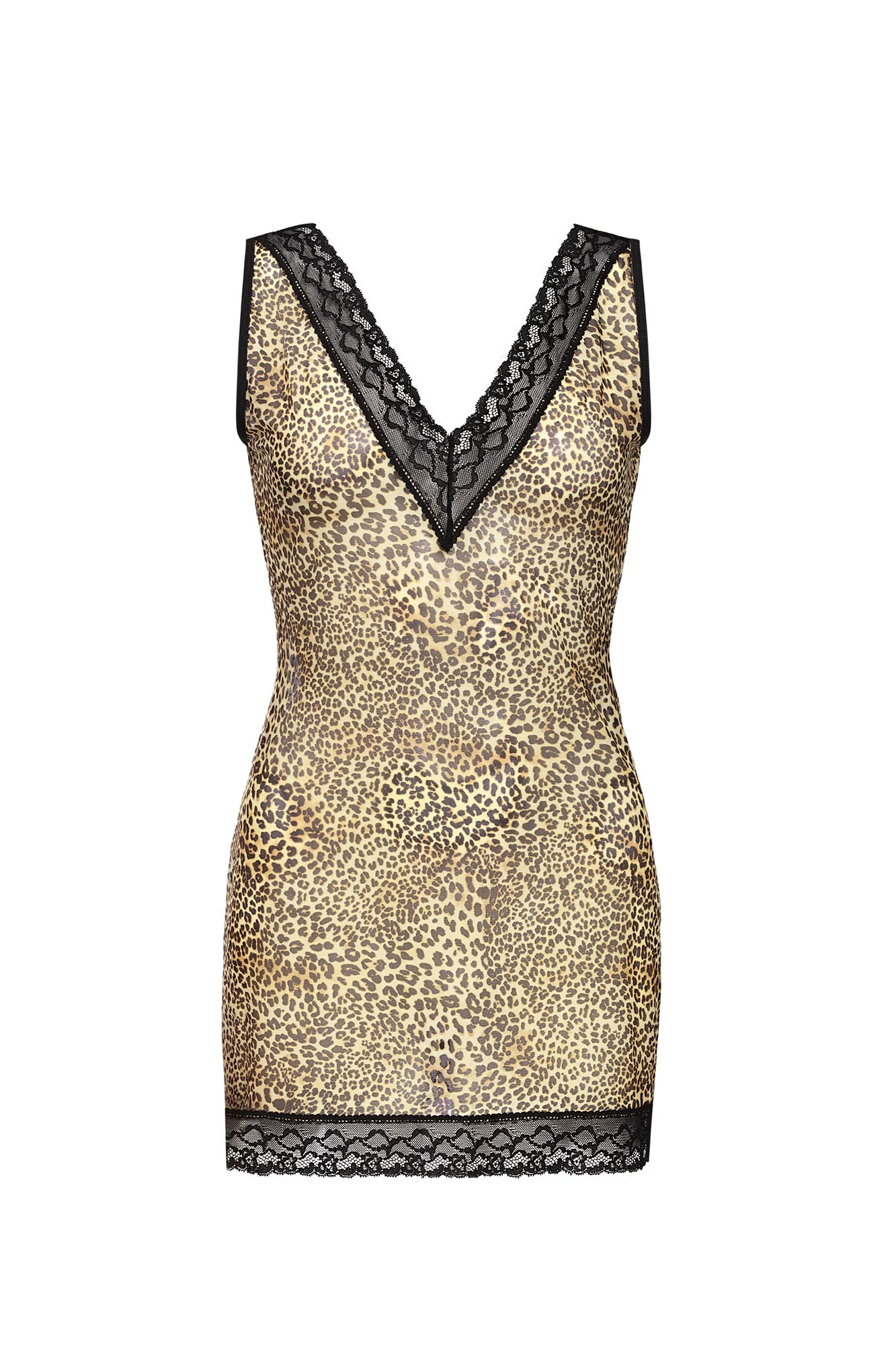 Přiléhavá na tělo, lehce průsvitná noční košile z mimořádně zajímavé, na dotek příjemné elastické látky s leopardím vzorem, v krásných, teplých barvách. Výstřih do V s krajkovým lemem, stehna rovněž zahalená do krásné krajky. 90 % polyamid, 10 % elastan.