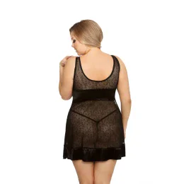 Fenomenální, velmi ženská a zároveň neuvěřitelně pohodlná noční košile. Černá barva, navržená s ohledem na větší velikosti. V horní části vypasované, se saténovým lemem na prsou, který v tomto místě imituje něco jako polokorzet. Tkanina je zvýrazněna jemným květinovým vzorem a je měkká a jemná. Stehna se saténovým lemováním. Volné dno, velmi pohodlné. Tanga jsou součástí balení. Složení: 80 % polyamid, 20 % elastan.