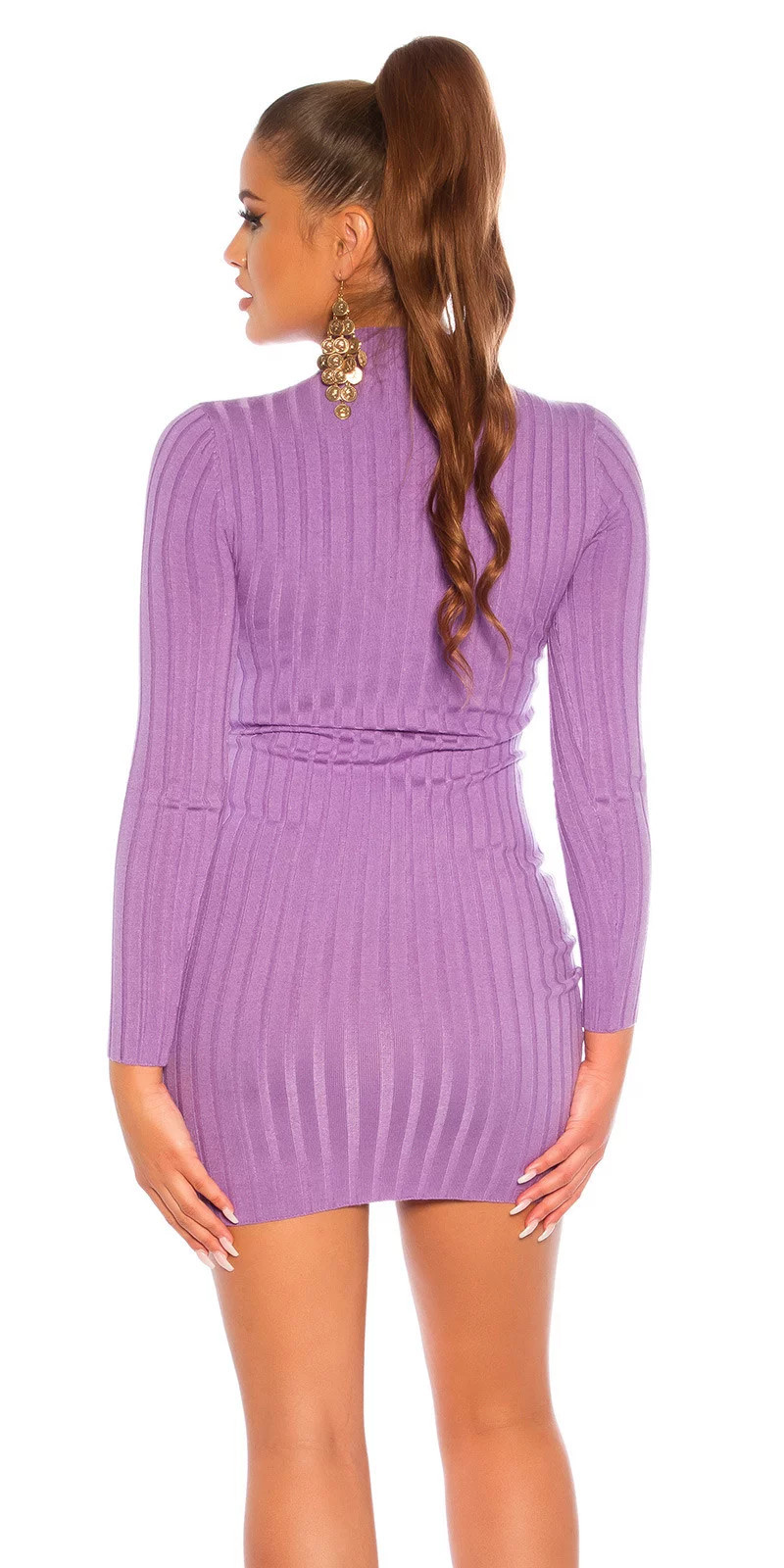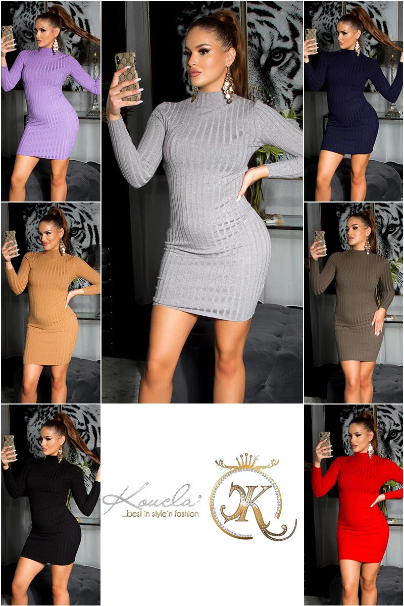Dámské krátké pletené šaty s hrubým skládáním, délka nad kolena, dlouhé rukávy, u krku mírný stojáček.