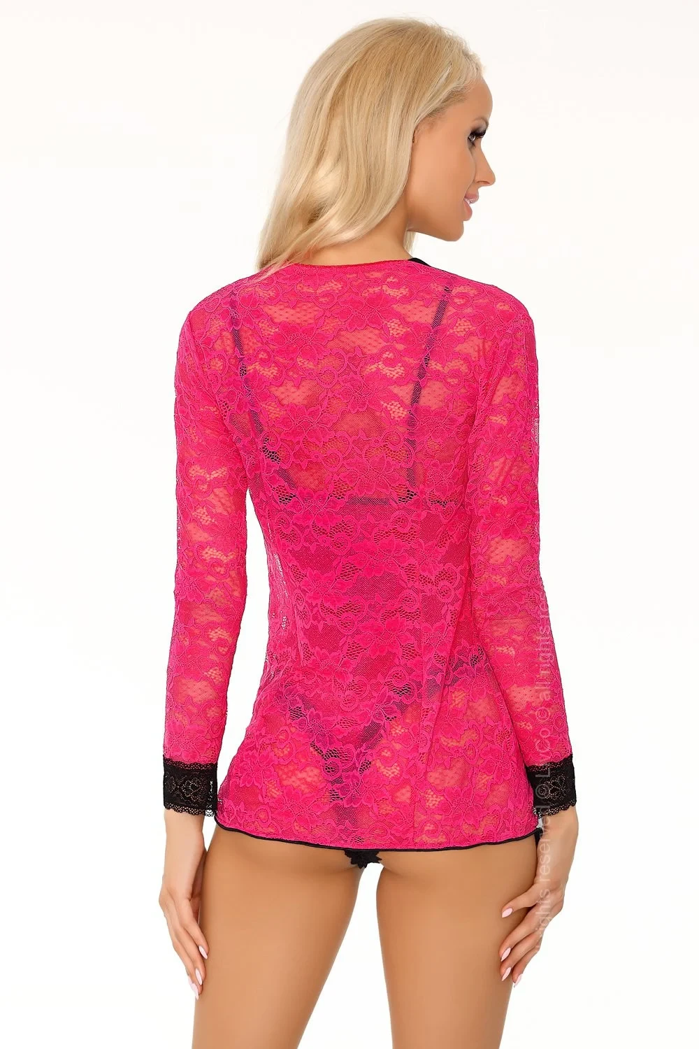 Sexy body a mini župánek v jedné sadě. Vyrobeno z růžové elastické krajky doplněné černými doplňky. Body dokonale zdobí tělo, zvýrazňuje hýždě a potěší sexy střihem košíčků. Negližé vzdušně doplňuje celý komplet a zvyšuje jeho atraktivitu.