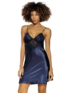 Exkluzivní saténová souprava nočního prádla v krásné tmavě modré barvě. Dvoudílné, velmi měkké a pohodlné. Tkanina má jemný, ušlechtilý lesk. Profilované košíčky zdobené vyšívaným tylem. Nastavitelné popruhy. Šortky na gumičku.