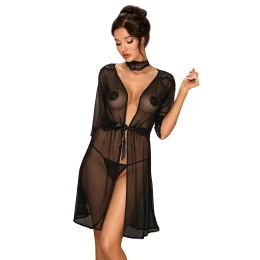Dnes je váš večer! Vklouzněte do tohoto smyslného, lehce průsvitného negližé a užijte si sexy vzhled. Negližé lze také nosit přímo na nahém těle, což umocňuje svůdný efekt (nebo jednoduše přes spodní prádlo). Zamilujete si jeho jemnou měkkost, krajkové zdobení, krajkový pásek převázaný saténovou mašlí a okouzlující nákrčník, který je rovněž součástí soupravy. Neváhejte, toto smyslné negližé prostě musí být vaše. Tanga nejsou součástí balení.