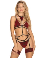 Třídílná souprava spodního prádla z efektní krajky v barvě červeného vína. Pokryté stylovým květinovým ornamentem. Vzor je cítit pod prstem a vypadá mimořádně ušlechtile. V tomto spodním prádle budete jistě vypadat nadpozemsky. Sada obsahuje podprsenku s měkkými košíčky s ozdobnými tenkými ramínky na dekoltu, krásné, pohodlné kalhotky a podvazkový pás v podobě elastických pásků s odpovídající krajkovou ozdobou na krku.