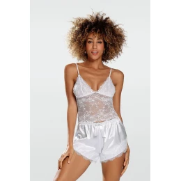 Set Estera tvoří žhavé saténové šortky zdobené krajkou a krajkový krátký top odhalující bříško. Tato souprava smyslného spodního prádla je ideální pro ženu, která chce popustit uzdu svému vnitřnímu sexappealu. Krajkový top je odvážný a provokativní, zatímco saténové šortky jsou hedvábné a svůdné. Ať už chcete okořenit svůj milostný život, nebo se jen cítit sexy sama pro sebe, tato souprava vás jistě potěší. Připravte se tedy na to, že se budete cítit úžasně v něčem trochu nemravném.