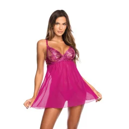 Půvabná noční košilka v intenzivním odstínu fuksie. Košíčky jsou vyrobeny z lesklého haftu a podloženy dráty, díky čemu nádherně zdůrazňují tvar poprsí. Volný dolní lem z tylu jemně obepíná postavu. Štiplavosti přidává rozpark zezadu. Košilka se zapíná na dvouradý háček s regulací. V sadě jsou i tanga.