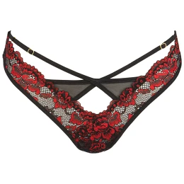 Tanga s hlubokým výstřihem a smyslně svůdným červenočerným květinovým krajkovým překrytím nesmí chybět ve vašem šuplíku se spodním prádlem. Přední část modelu je neobvyklým způsobem kombinována s trojúhelníkovými tylovými vsadkami a převýšenými ramínky zdobenými regulátory ve zlaté barvě. Pohodlná a zároveň krásná tanga jsou skvělým doplňkem modelu podprsenky V-10021.