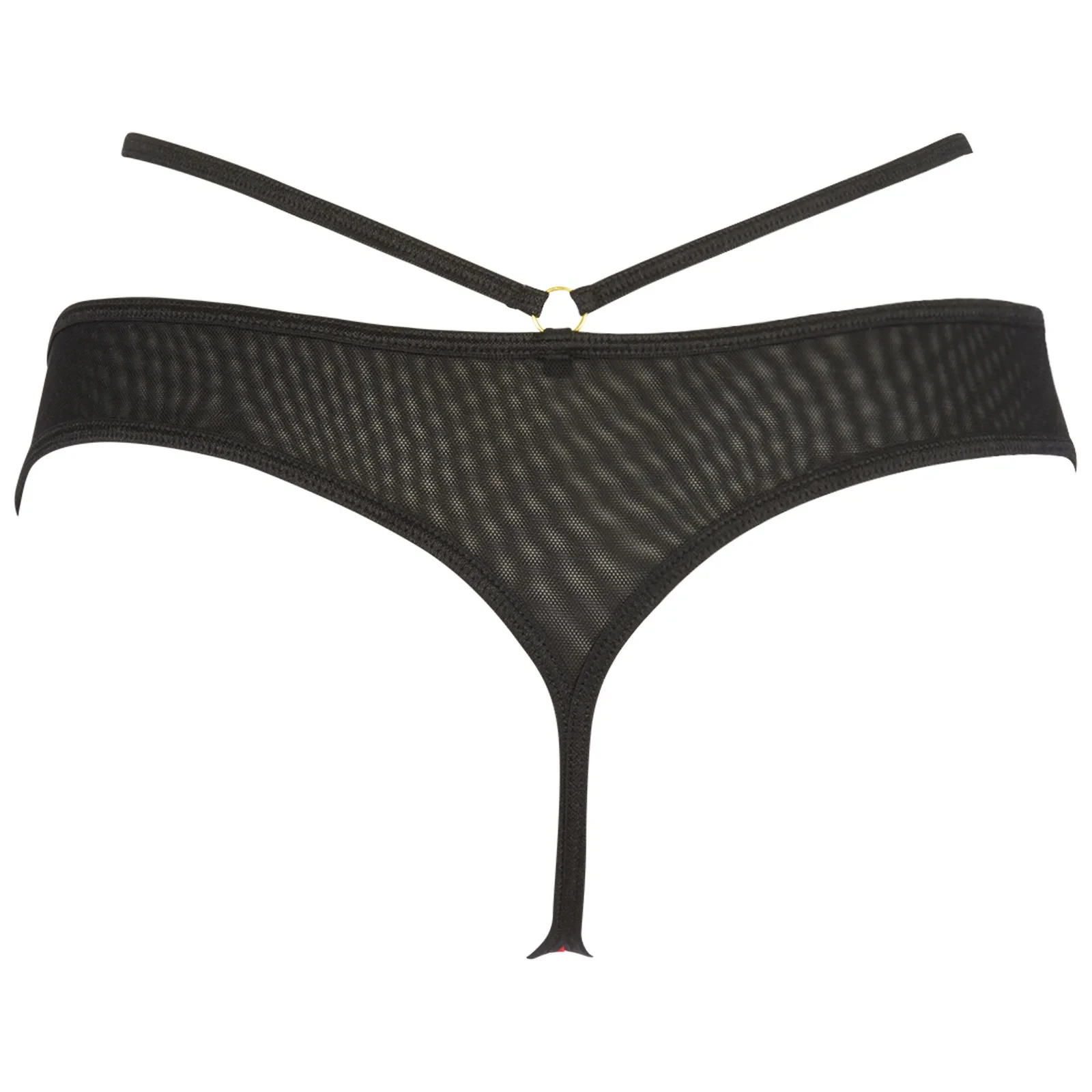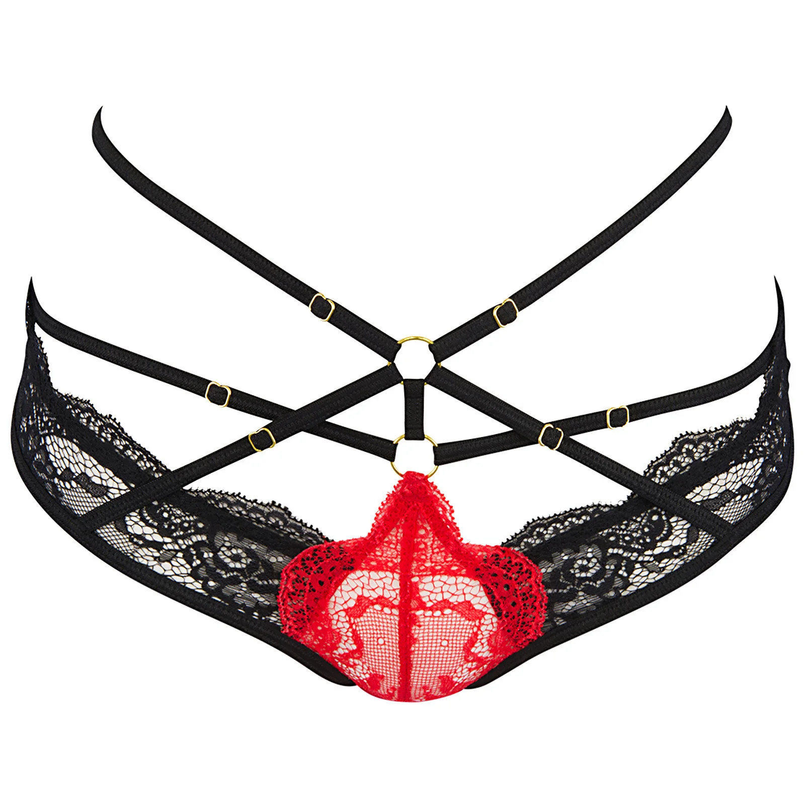 Tato černo-červená, sexy vykrojená tanga na ramínka dokáží rozpálit smysly! Jemnost látky a neuvěřitelně smyslný střih dělají z tohoto modelu nezbytný doplněk vašeho šuplíku se spodním prádlem. Kalhotky dokonale padnou díky regulaci na ozdobných pásech, které jsou zdobené ornamenty ve zlaté barvě.