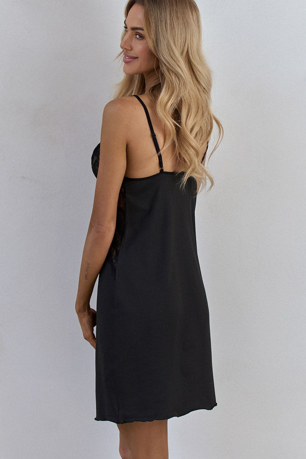 Černé noční košilka FOLW pro ženy - smyslná elegance pro speciální okamžiky. Noční košilka FOLW je rafinovaný a ženský model, navržený s ohledem na romantické večery. Tenké, nastavitelné ramínka umožňují ideální přizpůsobení postavě, zároveň zajišťují pohodlí při nošení. Přední část košilky zdobí efektní krajkový lem, který jemně obklopuje košíčky a plynule přechází na boky, celku dodává smyslný a elegantní charakter. Mezi košíčky je umístěn drobný mašlíček, zdůrazňující ženský styl, doplněný jemným, lesklým flitrem, který celku přidává jemnou nótu luxusu. Model FOLW je harmonické spojení pohodlí a estetiky, ideální volba pro ženy, které oceňují elegantní noční prádlo s smyslným charakterem.