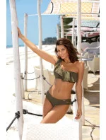 Součástí kompletu je podprsenka zavazovaná na zádech, která imituje top na jedno ramínko. Výstřih s velkým, vzdušným volánkem, vyrobený z lehké italské látky, vypadá fenomenálně. Krásné, sváteční barvy. Podprsenka je bez kostic, má tvarované, na vnitřní straně skryté vsadky modelující a zpevňující prsa, díky kterým poprsí vypadá atraktivně. Vsadky lze z modelu vyjmout, čímž vznikne "měkká" verze podprsenky. Kalhotky ve velmi dobré výšce, jsou velmi pohodlné a na bocích je zdobí svůdné prasklinky. Složení: 80 % polyamid, 20 % elastan.