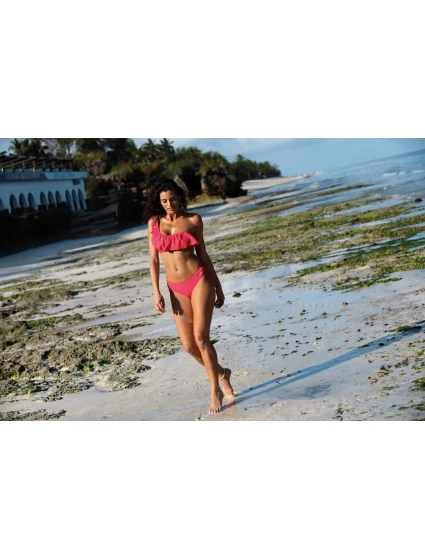Součástí sady je podprsenka se zavazováním na zádech, která imituje top s jedním ramínkem. Výstřih s velkým vzdušným volánem z lehké italské tkaniny vypadá fenomenálně. Krásné prázdninové barvy. Podprsenka je bez kostic a na vnitřní straně má tvarované, skryté tvarovací a zpevňující vložky, díky nimž poprsí vypadá přitažlivě. Vložky lze z modelu vyjmout a vytvořit tak "měkkou" verzi podprsenky. Kalhotky mají velmi dobrou výšku, jsou velmi pohodlné a ke všemu je zdobí svůdné praskliny na bocích. Složení: 80 % polyamid, 20 % elastan.