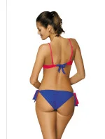 Podprsenka s vyztuženými košíčky, kosticemi a push-up výplní, trvale zabudovaná do modelu. Skvěle pozvedne prsa, vytvaruje je a svůdně zvětší, jak je vidět na fotografii. Ramínka (elastické pásky) jsou pružná, se zlatými šperky a mega módní. Dodávají jim skutečný sex-appeal, který si můžete na pláži směle dopřát. Nastavitelné, neodnímatelné ramenní popruhy. Elastický pásek, zavázaný na zádech. Spodní díl bikin brazilského střihu s vysokým vykrojením na hýždích - sexy a ideální na opalování. Pro dosažení plného brazilského efektu by měly být kalhotky výrazně vytažené nahoru směrem k bokům. Pohodlné úvazy na bocích. Ps. Kalhotky mají v zadní části dodatečné řasení na látce, které opticky smyslně zaobluje zadeček.